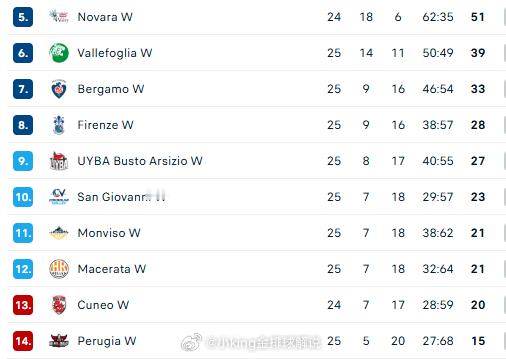 最后一轮女排意甲的保级形势:佩鲁贾铁定降级了,还剩一个队?1.库内奥vs瓦莱福利亚(瓦莱有摆烂可能,但库队需全取三分才可超圣队,这里库队压力最大)2.蒙维索vs科内(科内预计不会让分)3.马切拉塔vs贝加莫(贝加莫排名确定了,可能摆烂)4.圣乔万尼vs布斯托(圣有取胜可能)综上:圣队至少可以压住蒙维索了,那就保级成功。另外,我说摆烂的球队也不一定都敢放水。庄宇珊意大利女排联赛