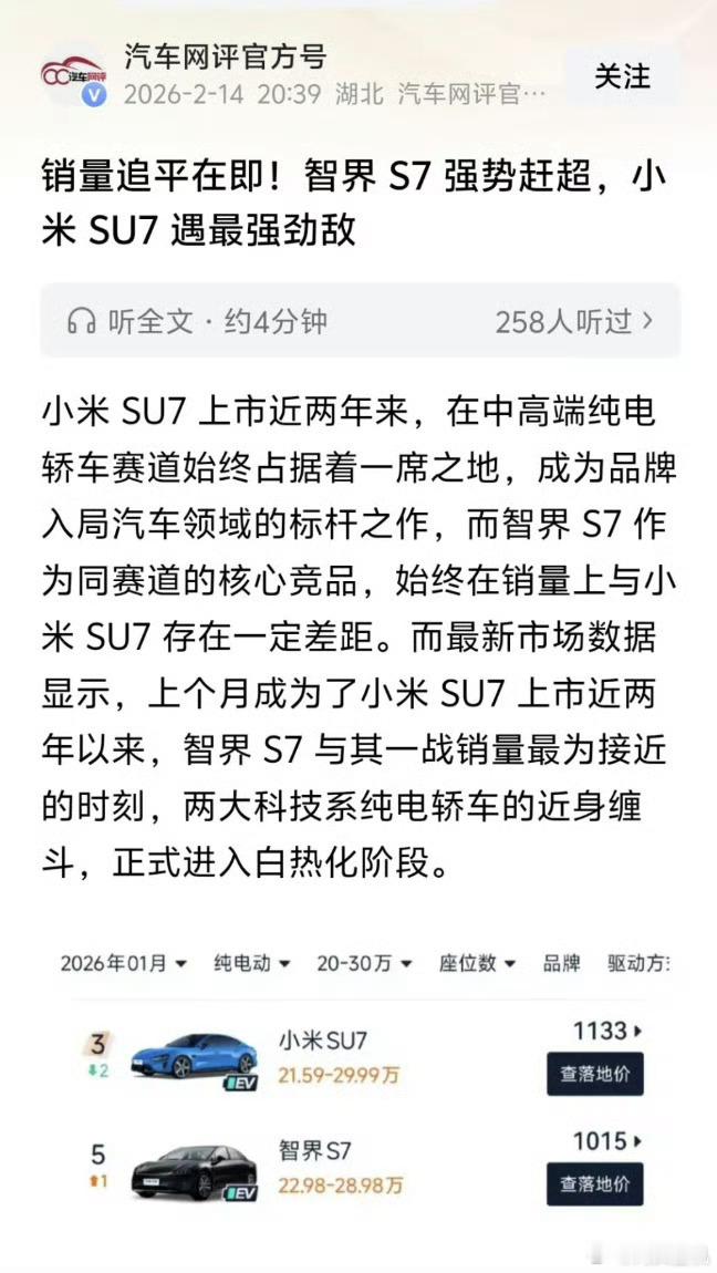 小米遭遇最强劲敌,智界S7强势赶超,前几天简单玩了个梗,没想到真有媒体这么报道,这个汽车网评真是把网友的智商按在鞋底里摩擦,精准筛选目标用户吧?这个月就该换标题了,这个月小米SU7的交付数量应该是0台,下个月的标题可就不仅仅是强势赶超,而是直接吊打了。数码科技评论