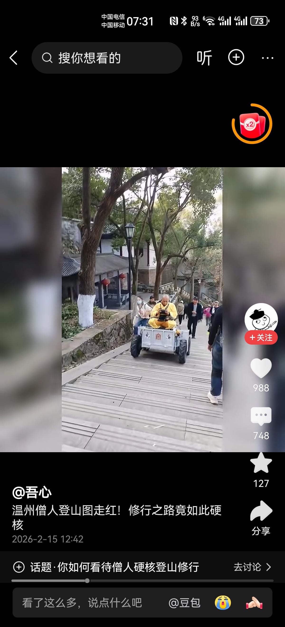 看到僧人如此登山,我第一个想到的是释永信。从小说以及古装电视剧看到的寺庙僧人的生活,一直相信他们信仰佛教,比较清贫,因为信仰,只以清修为养性,不以赚钱为目的。但是,后来去一些景区游玩以及从头条看到的一些关于寺庙的相关信息后,在他们面前,大多人都是穷人。他们生活在高山上,我们都生活在山脚下,差了无数的阶层。 再提起他们的信仰,我们还能信吗?