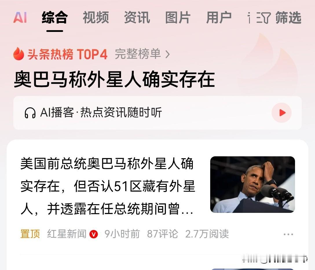 又开始了,大家看看又开始了,白头鹰那边一旦遇到点什么难堪的事情,肯定就把外星人拿出来转移火力 反正美国民众特别吃这一套,美国人对外星人,对外星文化有一种宗教一样的痴迷 拿这种新闻来转移话题,比桃色新闻还好用 美国当地时间14号,奥巴马在最新发布的访谈视频中表示,外星人确实是存在的 可是同时他还表示,我知道他确实存在,但是自己也从没有看见过 随后,他又否认了传说中51区的存在 这就有点意思了,他前面确实肯定,后面却在不断的否定 那么他到底想表示什么东西呢? 故弄玄虚的目的是什么呢? 人为炒作一个热点,然后转移特朗普对他的炮火吗? 这种可能性是很大的
