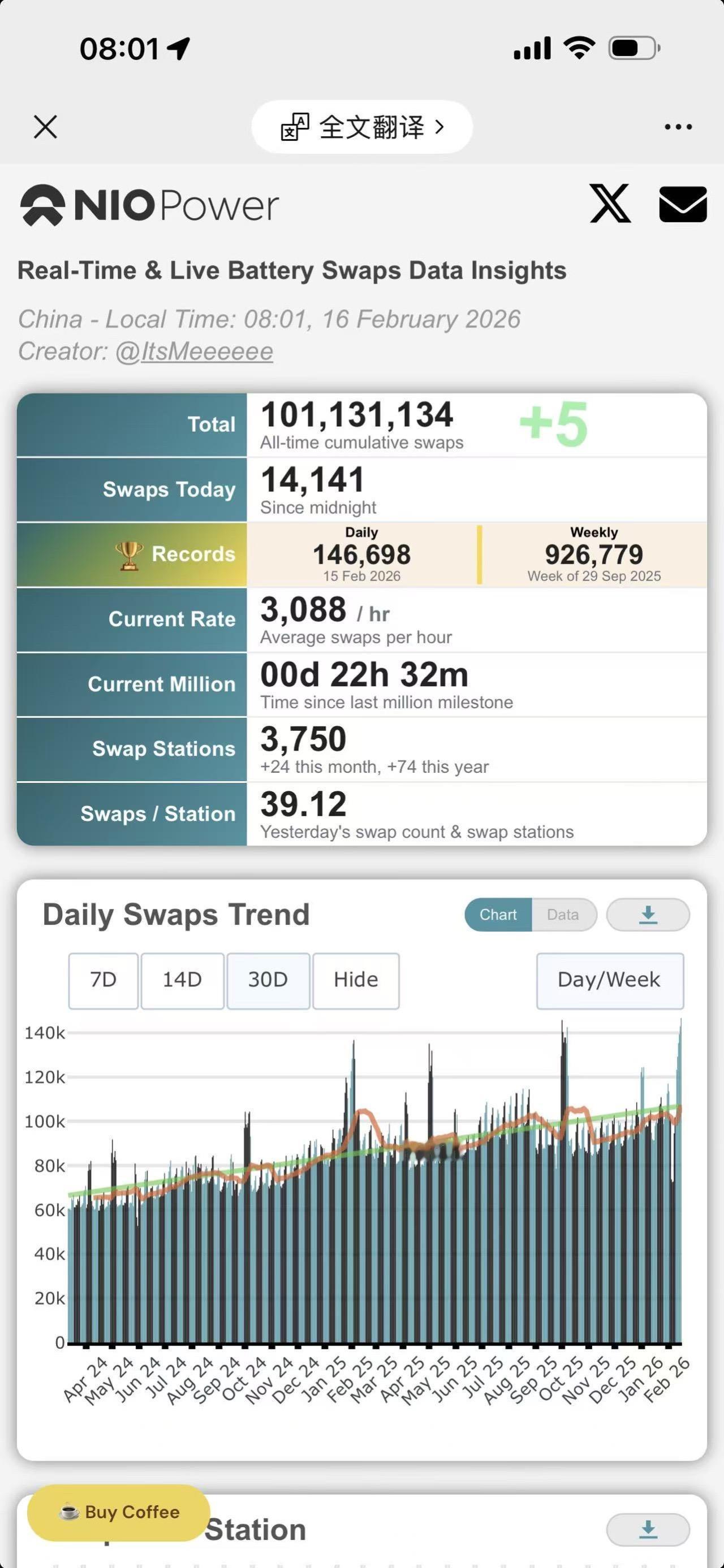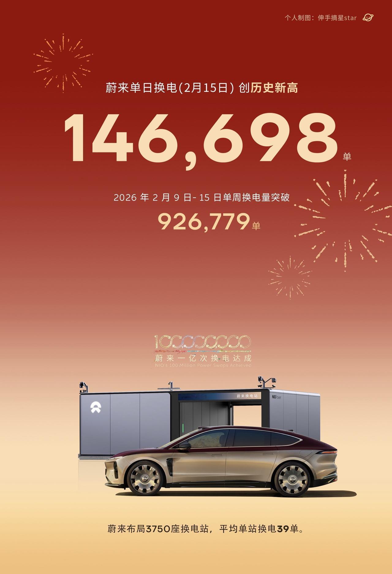 历史时刻!蔚来换电单日创新高破纪录!昨天,2月15日, 蔚来单日换电:146698单, 蔚来3750座换电站,单站均39单! 最忙的换电站应该有190+ 上周周换电达到了:9267798单。 周换电破百万也是指日可待呀。 春运期间,换电跟加油一样方便。蔚来 换电 蔚来换电 历史时刻