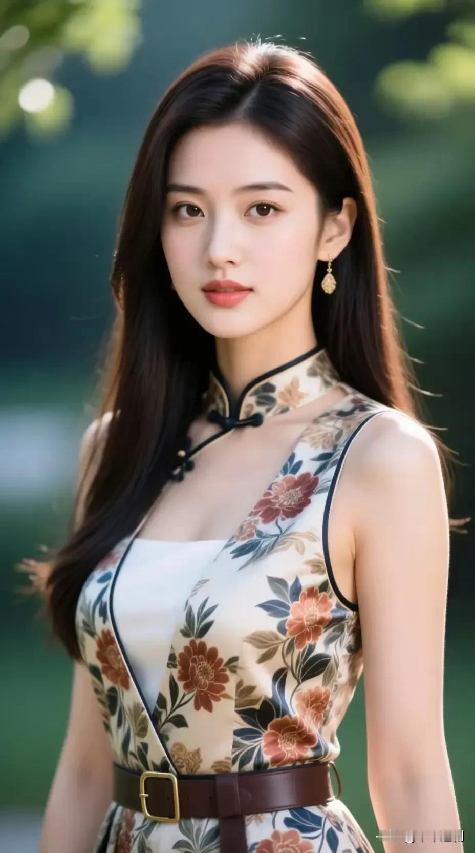 改良旗袍上的繁花与绿意相映, 盘扣轻系,腰带勾勒出腰身线条, 在自然的背景里,把东方韵味与现代感,都揉进了这一身温柔里。 旗袍古典新中式 旗袍古典美女