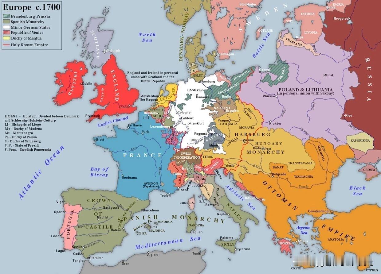 1700年的欧洲正站在从中世纪晚期王朝秩序向现代国家体系过渡的历史转折点上。强盛的君主制国家主宰着欧洲大陆,而庞大的帝国则跨越海洋延伸至各大洲。 路易十四统治下的法国是欧洲最强大的陆地势力,主导着欧洲的外交格局与战争走向。西班牙帝国虽然疆域辽阔,却已显颓势——1700年国王卡洛斯二世的驾崩即将点燃西班牙王位继承战争。 神圣罗马帝国虽在政治上支离破碎,却仍保持着重要影响力;奥斯曼帝国依然控制着东南欧大片领土。与此同时,英格兰、荷兰共和国以及彼得大帝治下崛起的俄罗斯,正逐渐成为举足轻重的战略力量。 因此,1700年的欧洲是一个王朝竞争激烈、同盟关系变幻莫测、全球野心不断膨胀的大陆——正处在崭新地缘政治秩序的前夜。 历史 地图