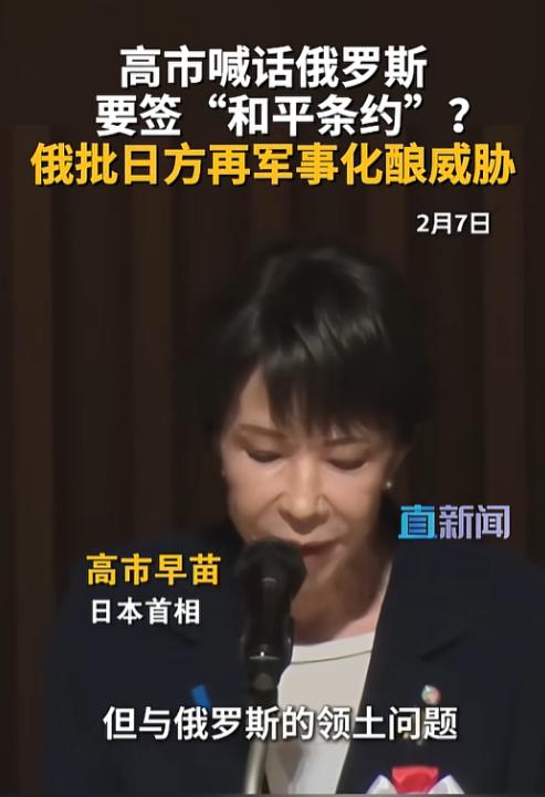 2月7日高市早苗又在“北方领土日”的大会上“演”了一出,她对着台下和镜头说,二战结束 80年了,日俄还没签和平条约,南千岛群岛的问题也没解决,自己“心里又遗憾又沉重”,还放话日本会“死磕到底,争取和俄罗斯谈出个结果”。   这话听着像在为和平奔走,其实明眼人都懂,这是演给日本国内看的戏。   而俄罗斯的回应一点没给面子,直接戳破南千岛群岛是二战结果定死的俄罗斯领土,主权“没的商量”,想谈可以,先老老实实尊重二战结果再说。   更打脸的是,早在之前俄罗斯就因为日本跟着西方对自己搞制裁,直接宣布拒绝和日本谈和平条约,还取消了日本人去南千岛群岛的免签待遇。   现在高市早苗再提这事,纯纯是“热脸去贴人家冷屁股”。   俄方之所以这么硬气,根本原因就在于日本最近的动作实在太扎眼,日方的防卫预算一年比一年高,到了2026财年更是直接飙升到了GDP的2%,这已经远远超出了它过去长期坚持的“专守防卫”框架。   还在北海道部署射程900公里的高超音速武器,从美国买反导系统,跟着美国在亚太搞军演。   对此扎哈罗娃直接点破,日本这是在“重新军事化”,对地区安全是实打实的威胁,谈和平?先把手里的刀放下再说。   说白了,高市早苗的喊话,就是一场政治表演,日本把2月7日定为“北方领土日”,每年都搞这种大会,无非是想凝聚国内情绪,转移社会矛盾。   可现实是,俄方国内78%的人都反对把岛还给日本,俄方根本没妥协的空间。   80年的僵局不是靠几句“和平”就能打破的,日本要是不放弃对抗思维,不停止跟着美国搞军事扩张,就算高市早苗喊破喉咙,和平条约也签不成,这场戏也只会越演越尴尬。