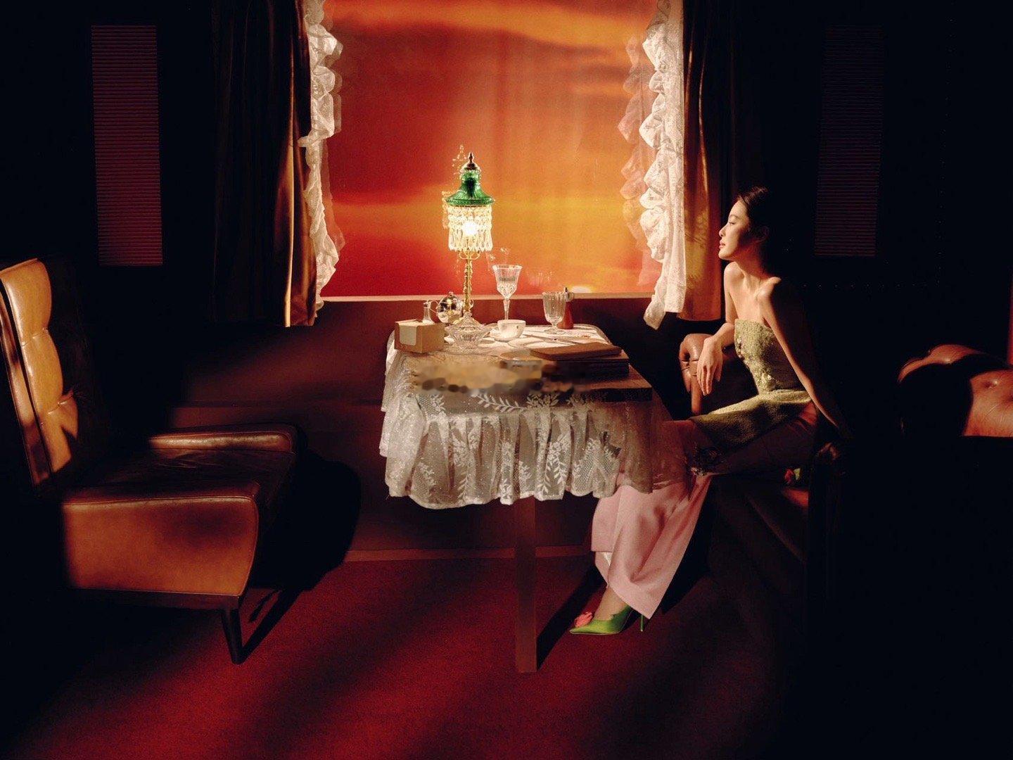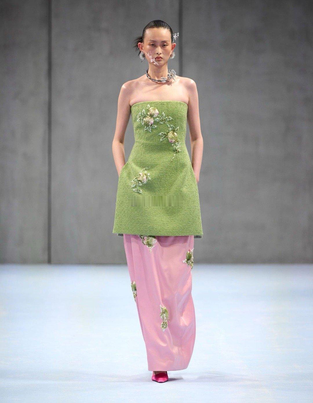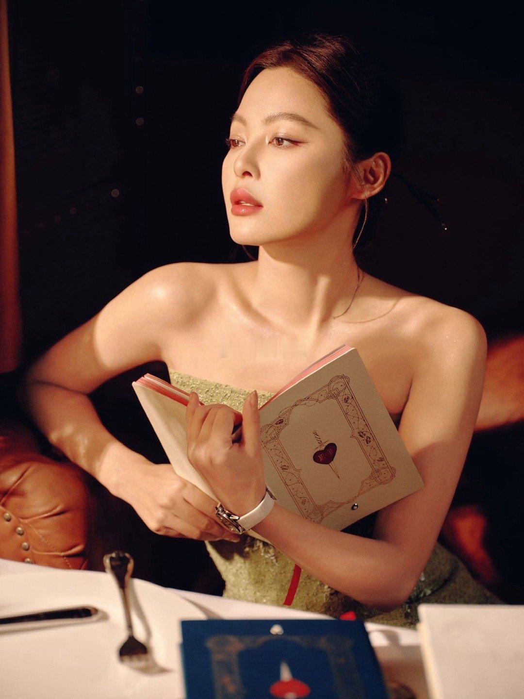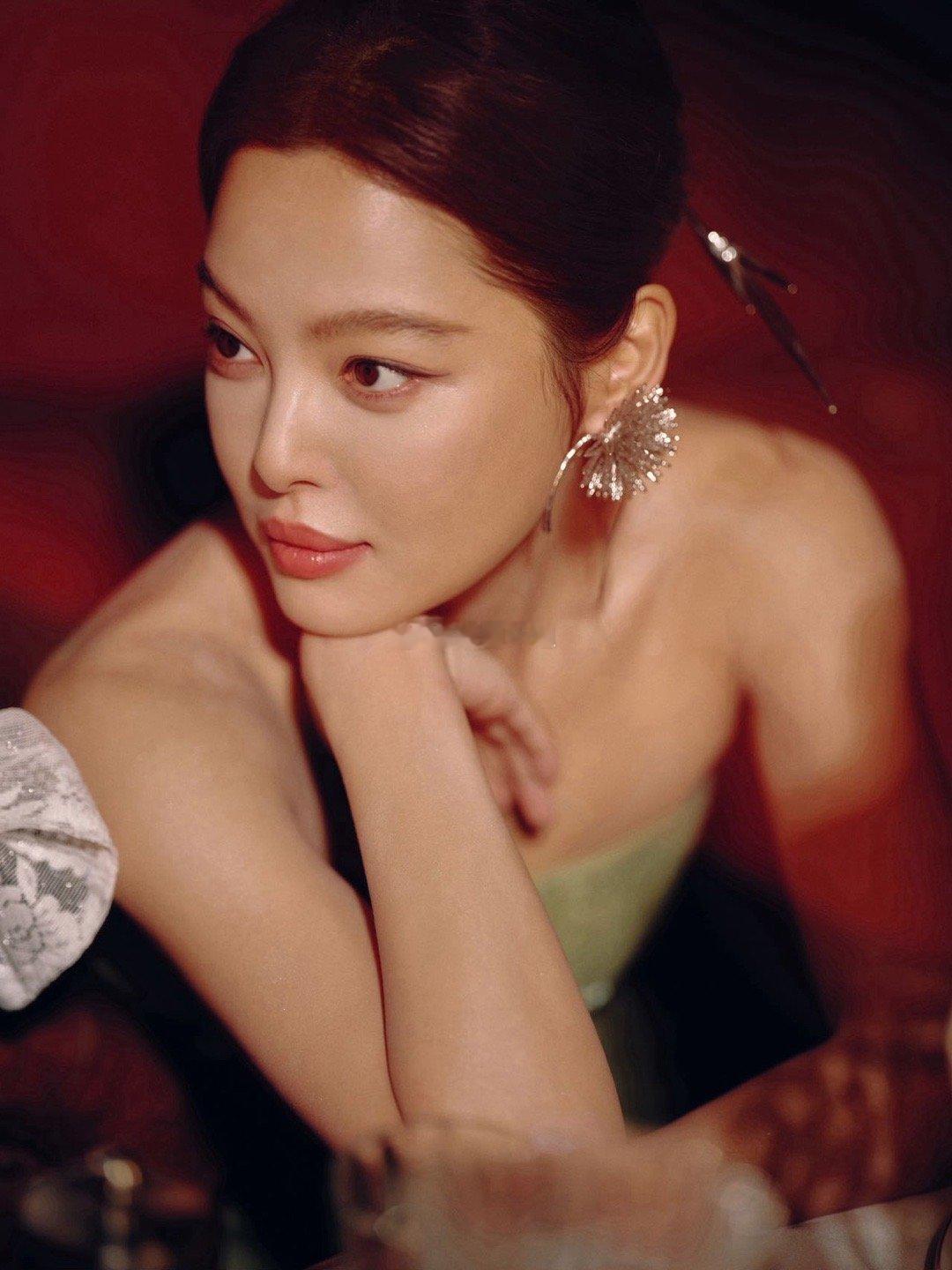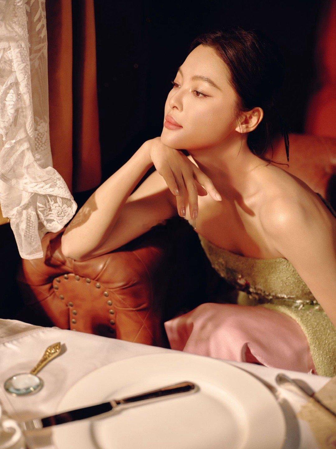 身着M ESSENTIAL青桃垫绣轻礼服,盘发古典、眉目如画。在朱红屏风与青瓷瓶器中凝眸,宛如从东方画卷中走出的贺岁佳人。