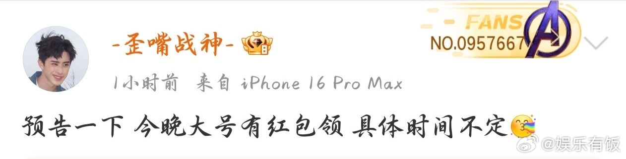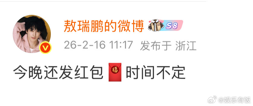 敖瑞鹏红包预告敖瑞鹏连续两年发红包预告 散财童子他又来啦!继去年在小号剧透后,今年更是直接在大号发红包预告啦!蹲守一个