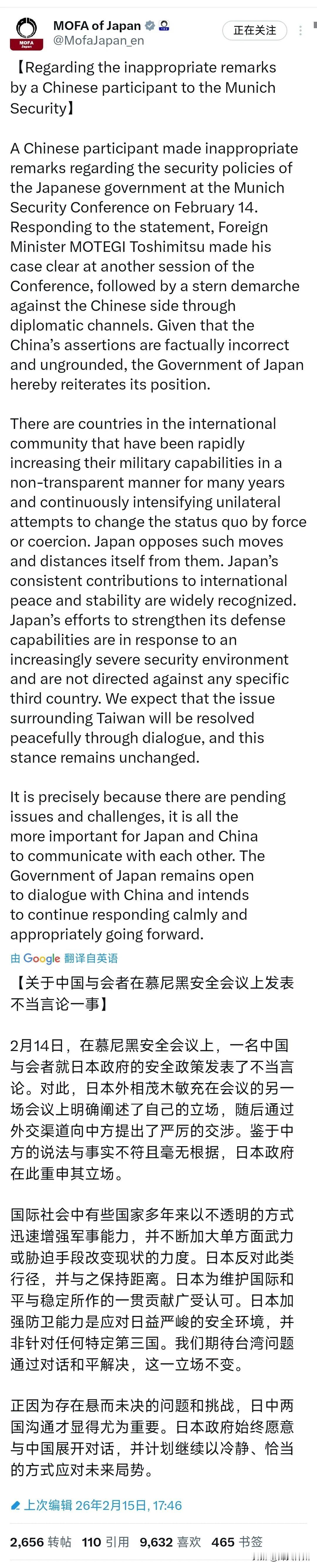 日本外务省昨天(2月15日)发布英文声明,回应王毅外长在慕尼黑安全会议的讲话。日方的声明在社交媒体X上引发激烈讨论。日方声明如下: 【关于中国与会者在慕尼黑安全会议上发表不当言论一事】 2月14日,在慕尼黑安全会议上,一名中国与会者就日本政府的安全政策发表了不当言论。对此,日本外相茂木敏充在会议的另一场会议上明确阐述了自己的立场,随后通过外交渠道向中方提出了严厉的交涉。鉴于中方的说法与事实不符且毫无根据,日本政府在此重申其立场。 国际社会中有些国家多年来以不透明的方式迅速增强军事能力,并不断加大单方面武力或胁迫手段改变现状的力度。日本反对此类行径,并与之保持距离。日本为维护国际和平与稳定所作的一贯贡献广受认可。日本加强防卫能力是应对日益严峻的安全环境,并非针对任何特定第三国。我们期待台湾问题通过对话和平解决,这一立场不变。 正因为存在悬而未决的问题和挑战,日中两国沟通才显得尤为重要。日本政府始终愿意与中国展开对话,并计划继续以冷静,恰当的方式应对未来局势。 评几句: 日本外务省近期发表的相关声明,逻辑明显站不住脚,充满双重标准。一方面对中方正当维护国家主权与领土完整的表态随意指责,另一方面却对自身此前涉及台海的不当言论避而不谈,这种片面态度难以获得国际社会认同。 日方一边自我标榜致力于地区和平,一边却不断强化军事力量、在地区内制造紧张氛围。面对历史问题,日方始终缺乏真正的深刻反思,反而在错误道路上越走越远。 中国始终是亚太和平与稳定的坚定维护者,国际社会有目共睹。任何刻意渲染危机、挑动对立、违背历史潮流的做法,都不利于地区稳定与发展。 公道自在人心,日方如果继续执迷不悟、固守对抗思维,只会进一步损害自身形象,最终必将自食恶果。