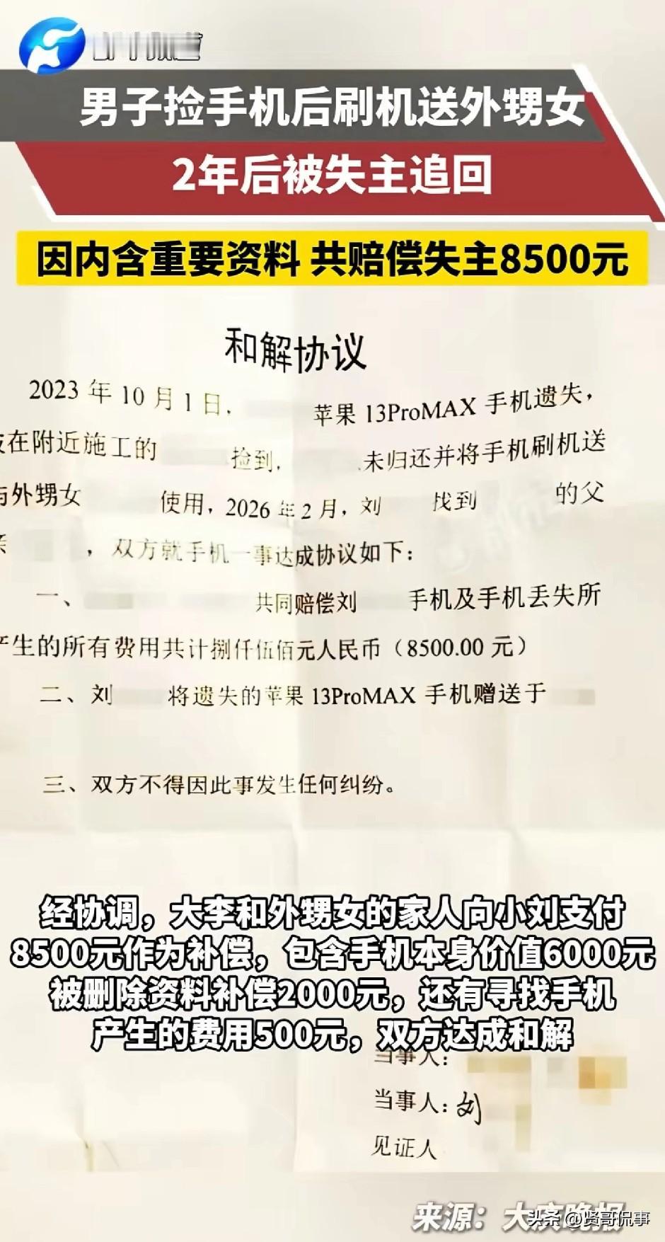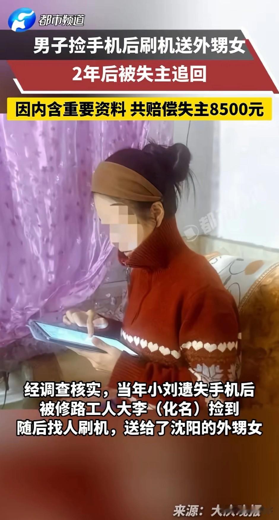 “贪小便宜吃大亏!”黑龙江大庆,一男子在路上捡到一部苹果手机,随后,男子将手机刷机送给了自己的外甥女。然而,让人没想到的是,两年后,失主竟带着警察寻上门来,要求拿回手机。最终,男子一方自知理亏,经协调掏出8500元对失主进行补偿,此事才作罢!网友:“有这钱买一款新的不香吗?” 事情是这样的,2023年国庆期间,女孩小刘在出门购物时,不慎弄丢了自己的一部苹果手机。 这部手机对小刘来说非常重要,里面存着大量学习资料、个人信息和家人的照片。 在发现手机不见后,她立刻沿着来时的路反复寻找,来来回回找了好几遍,都没有找到。 无奈之下,她只得选择了报警。 报警之后,小刘也依旧没有放弃寻找,她通过登录手机官方平台查询设备状态,显示手机尚未被激活。 那段时间,由于她正处于备考阶段,时间紧张、压力较大,只能暂时把找手机的事情放在一边,但心里一直惦记着这件事。 直到2024年8月,小刘再次登录官方平台时,意外发现丢失的手机已经被激活,并且有了插卡使用的记录。 于是,她立刻向手机品牌客服提交申请,希望能查到手机的下落。 很快,客服来电表示这部手机曾在绥化市被刷机,目前正在沈阳市被人使用。 小刘看到了希望,便马上将这一情况向警方报告。 为了帮小刘追回手机,民警专程赶往沈阳,找到了现在使用手机的人。 原来,小刘当年丢失手机后,被在附近修路的工人李某捡到。 李某在捡到手机后并未在第一时间寻找失主,也未向警方上交,而是找人把手机刷机清空了数据,之后当作礼物送给了在沈阳的外甥女。 无疑,从法律上来说,李某的行为属于侵占。 《民法典》明确规定,拾得遗失物后,拾得人负有妥善保管、及时返还或送交有关部门的法定义务,私自占有、处分他人遗失物,本质属于侵权行为。 对于失主小刘而言,她本人有权要求返还原物或折价赔偿。 同时,李某擅自刷机清除小刘的学习资料、个人信息等数据,属于错上加错,本质上属于故意损害他人财产权益,由此造成的无形损失,也同样需要赔偿。 当然,对于李某的外甥女而言,她是免费拿到手机的,并不算是合法取得,因此,也必须归还手机或者由家人承担赔偿责任。 事情查清后,民警对李某等人进行了释法说理,最终,李某及其外甥女的家人同意向小刘支付8500元作为补偿。 其实这件事最值得思考的是,很多人心里都有一个误区:觉得捡到的东西,只要不是偷来抢来的,就理所当然算作是自己的了,自己想怎么处置就怎么处置。 可从道理和法律上来说,捡来的东西,从来都不属于你,更不能随意处置。 拿本案来说,对于李某而言,你可以去疼爱外甥女,也可以给晚辈送份礼物表达心意,但绝不能拿别人的财物去送人情。更不该私自刷机、删除数据,把别人存在手机里的重要信息彻底毁掉。 看上去李某像似占了个小便宜,结果到最后既要赔钱,又丢面子,还给和外甥女的关系弄得特别尴尬,真的值得吗? 对此,你怎么看呢?欢迎大家在评论区留言。