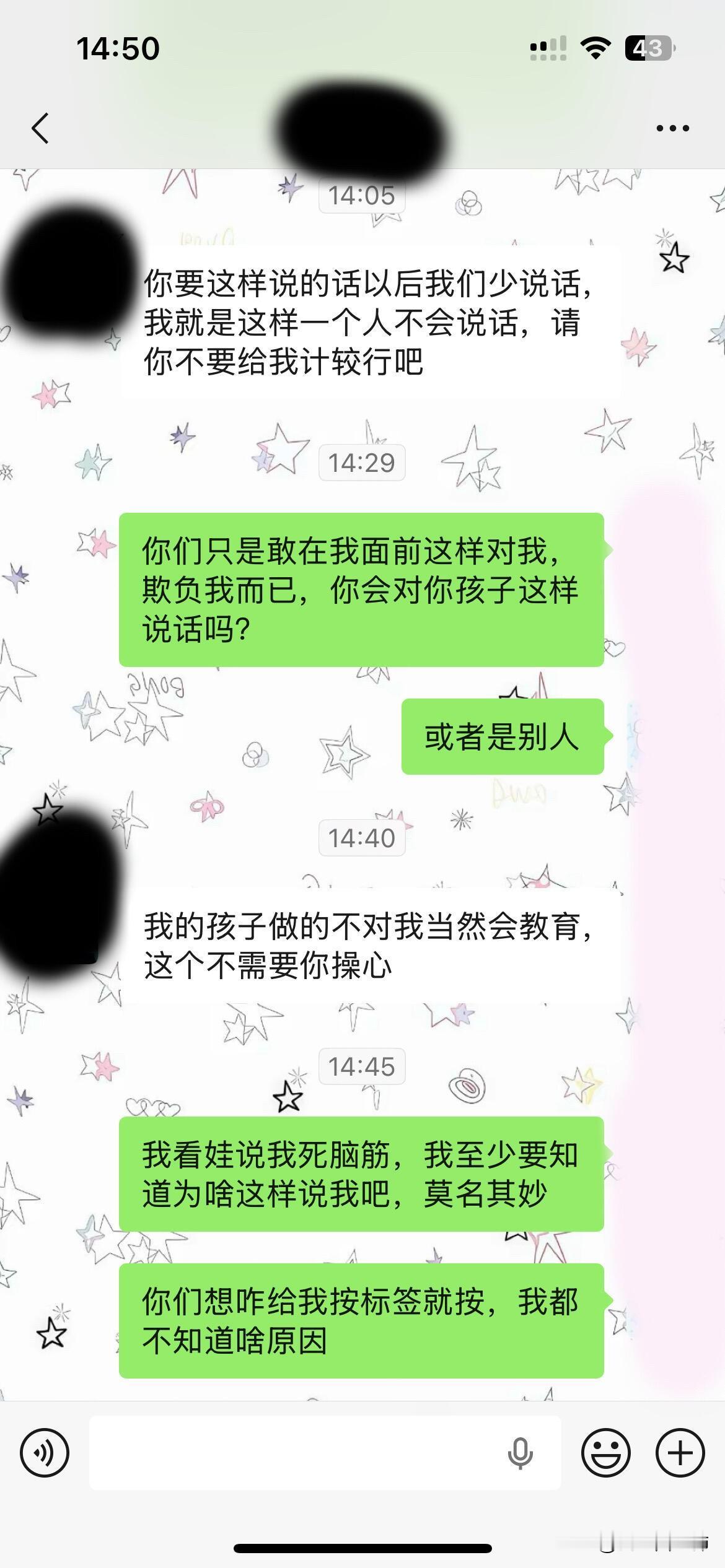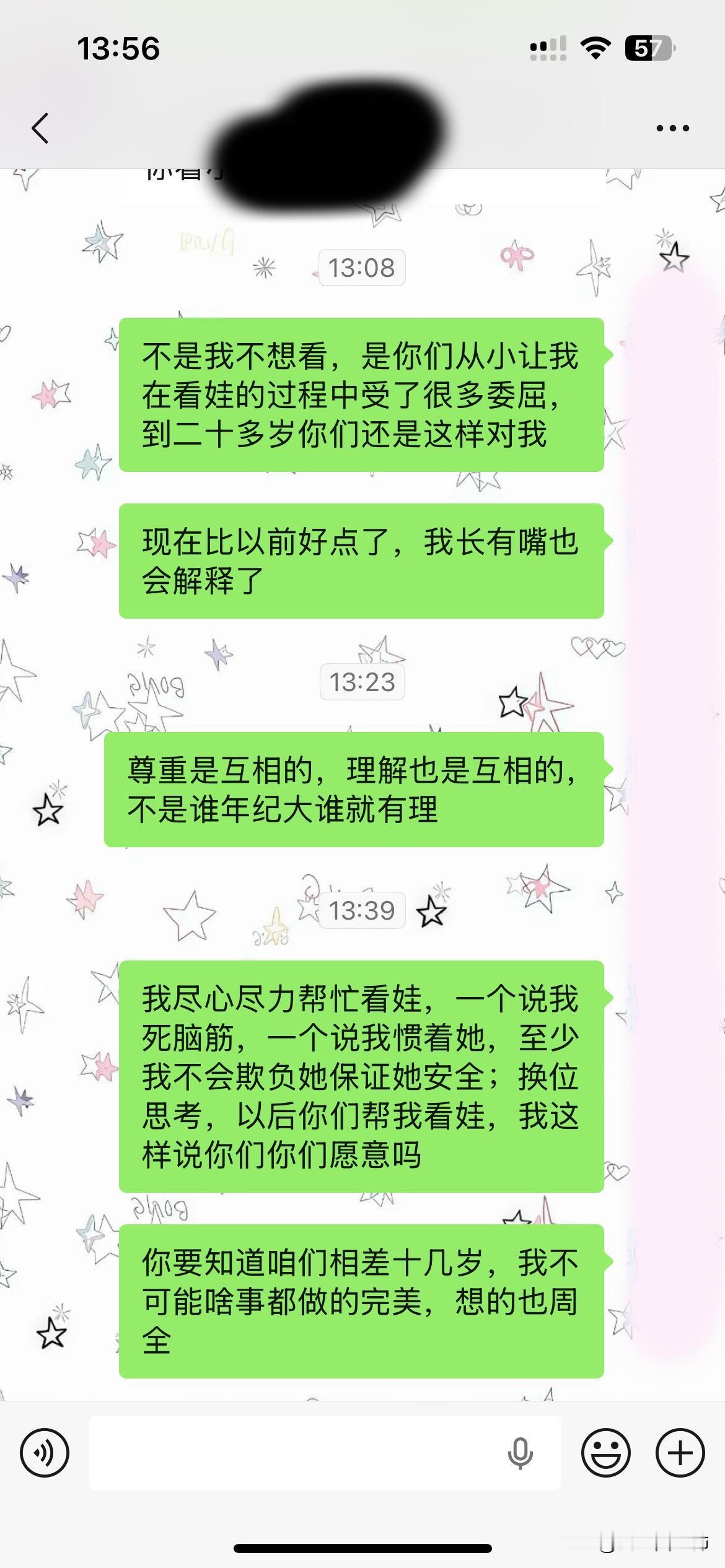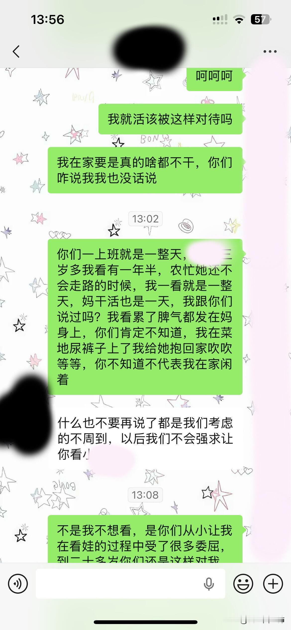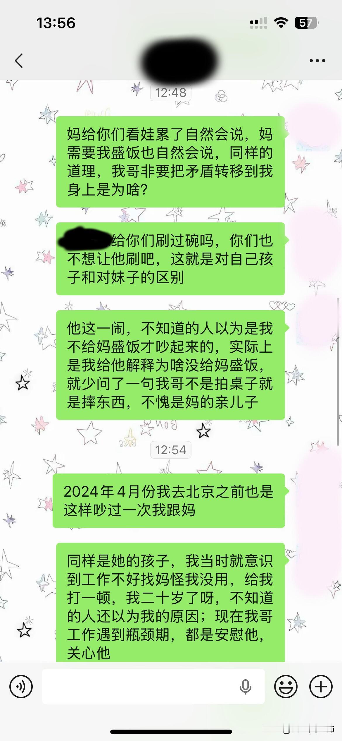 上面是我发给我嫂子的话,事情起因是中午我哥和我妈在厨房弄猪皮,我在客厅看我小侄女,我哥做好饭(一般都是他做饭我刷锅刷碗,他从来不刷碗)给他自己和小女儿的饭盛了,我就去盛自己的饭,没看到我妈没盛,他坐我旁边说我就顾着自己吃,给妈也盛了啊,我就给他解释为什么没给她盛,因为之前我妈在洗衣服我给她饭盛了,她说我盛真早干啥,她想让我盛给我说一下就好了,我肯定会去盛,我哥就开始指着我怪我说那么多话,顶嘴了,不是拍桌子就是摔碗摔凳子闹的可大,我只感觉憋屈