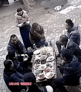 媳妇正在夹菜,朋友疯狂转桌。男子笑脸暴起,下手抓盘,把菜丢妻子碗里。妻子身上被溅