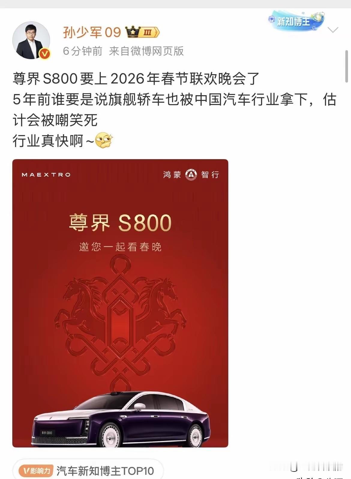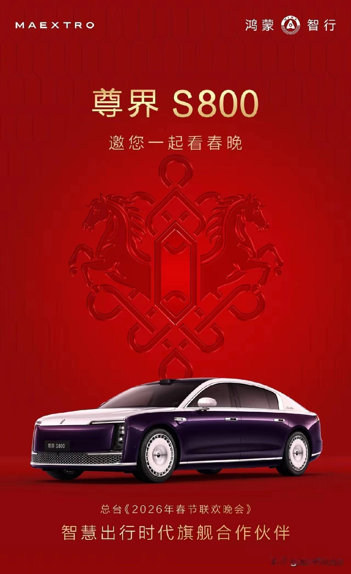 连续两年上春晚,尊界S800这回是真的火出圈了! 刚刷到孙少军转发的消息,尊界S800确定要登上2026年央视春晚了!官方还特意出了张马年主题海报,背景是匹奔腾的骏马,配上红红火火的中国结,年味直接拉满,C位就是大家熟悉的尊界S800。说真的,看到这消息我一点都不意外,因为它去年就已经上过一次春晚了。 记得去年它上春晚时,还只是作为背景板低调亮相,我身边有人问:“这尊界到底是个啥牌子?”那会儿它刚上市没多久,虽然定位七八十万的高端车,但确实没多少人认识。 才过了一年,现在的尊界S800早就今非昔比。路上能见度高了不少,网上关于它智驾和续航的讨论也特别多,销量更是干到了70万级以上豪华车的榜首 。 能连续两年站上春晚这个顶级舞台,绝对不是偶然。去年是来“刷脸”的新人,今年就是带着实打实的市场成绩回归的“常客”。除夕夜看春晚,我可要好好看看,这“春晚老熟人”今年会以啥形式登场。尊界S800 领航新锐创作权益升级