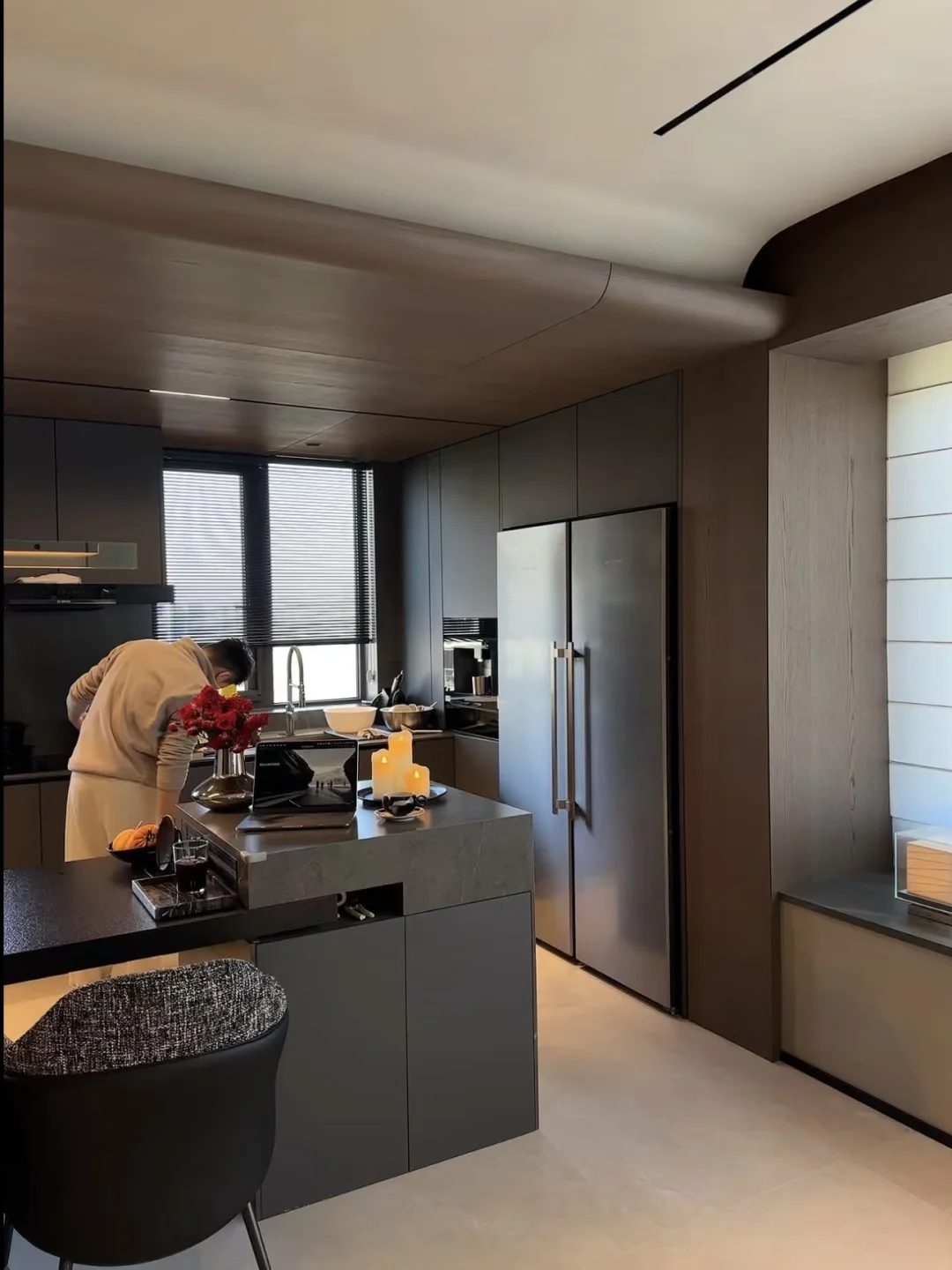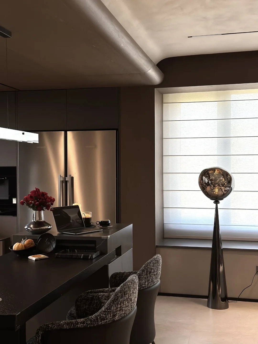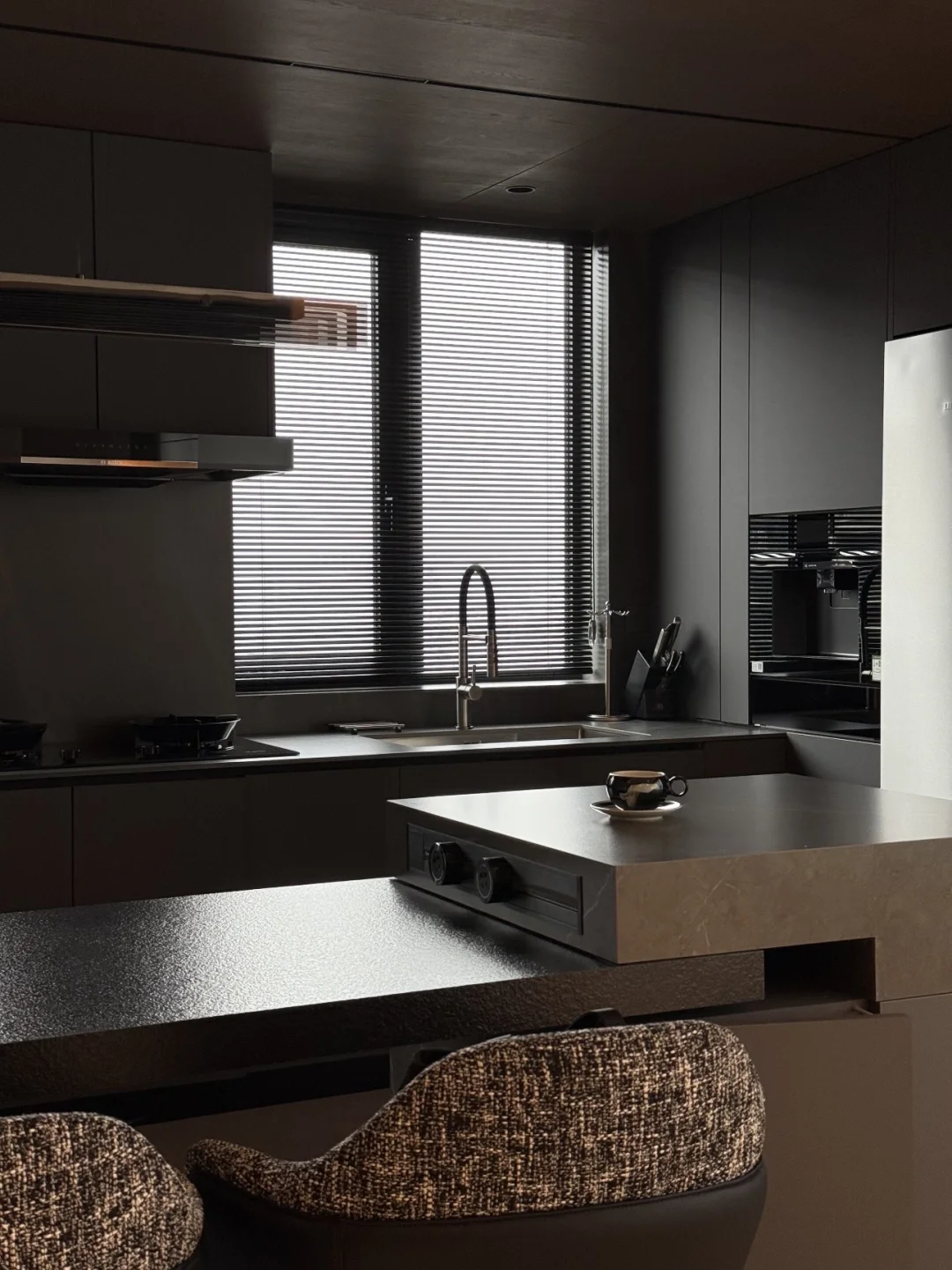 这是一组意式极简的餐厅厨房,窗帘用了罗马帘和黑色铝百叶,意式极简不仅仅是生活里精致和高级,更是营造一种独特的生活方式,一种有温度有格调耐看的居住体验。