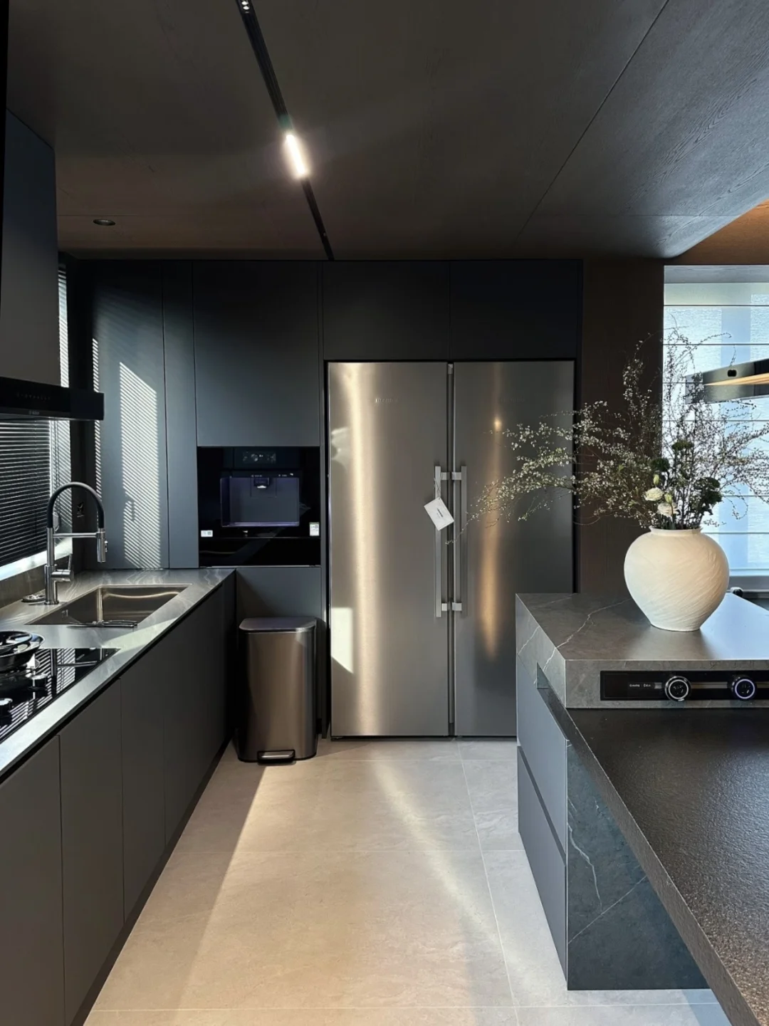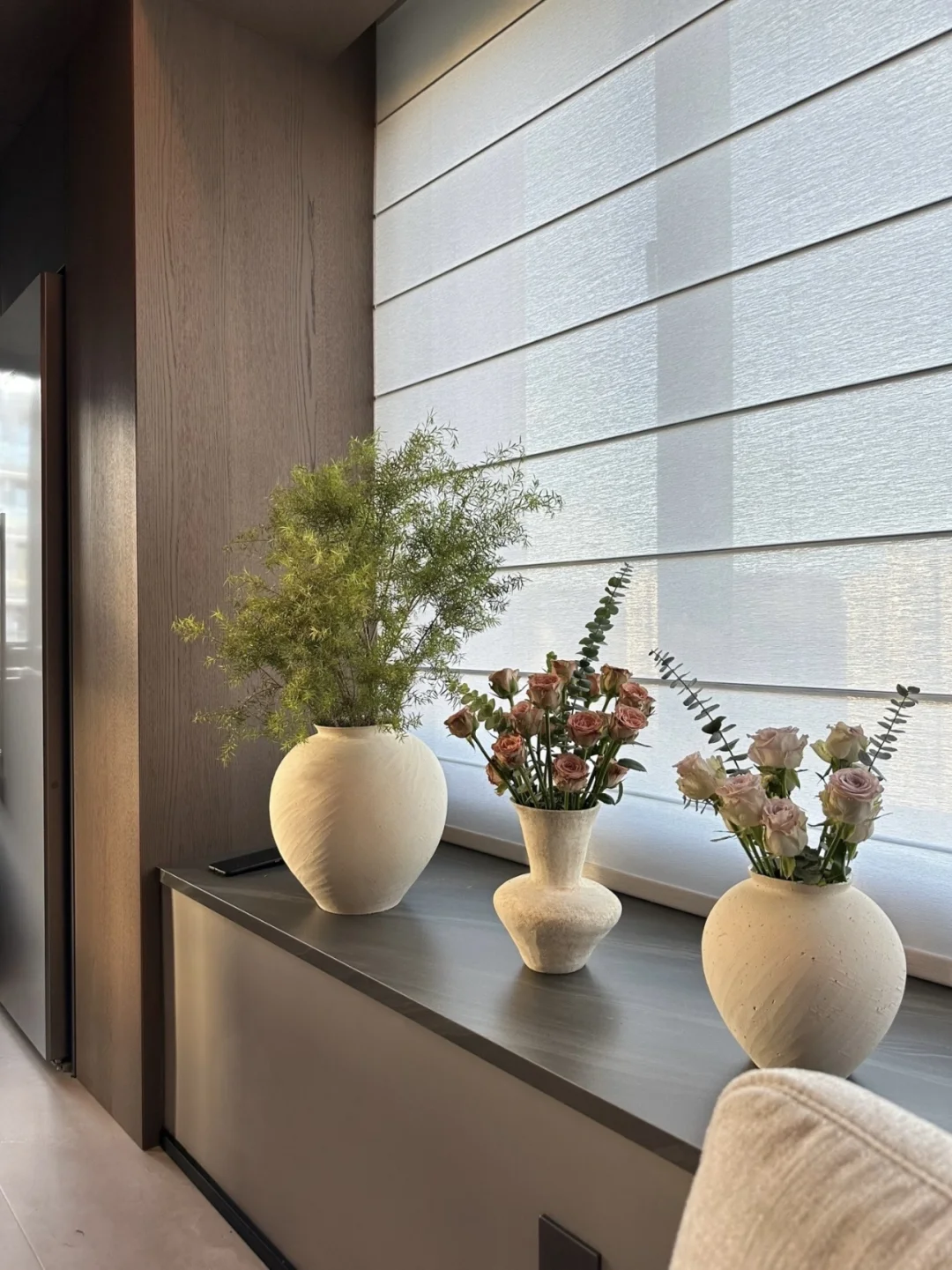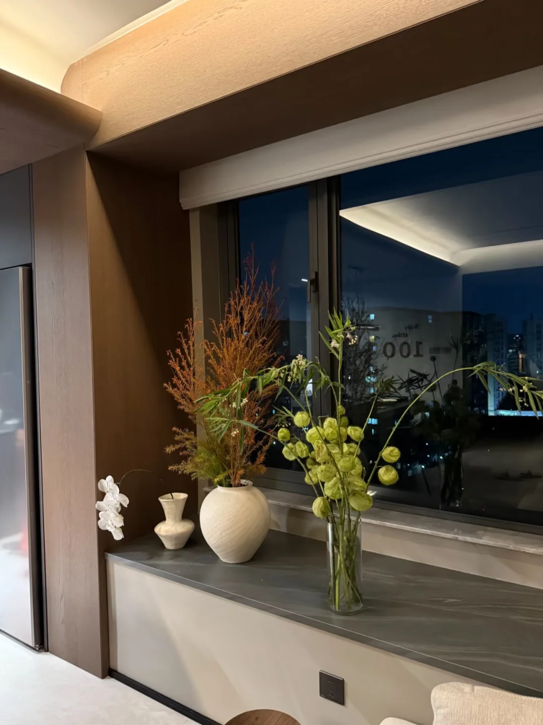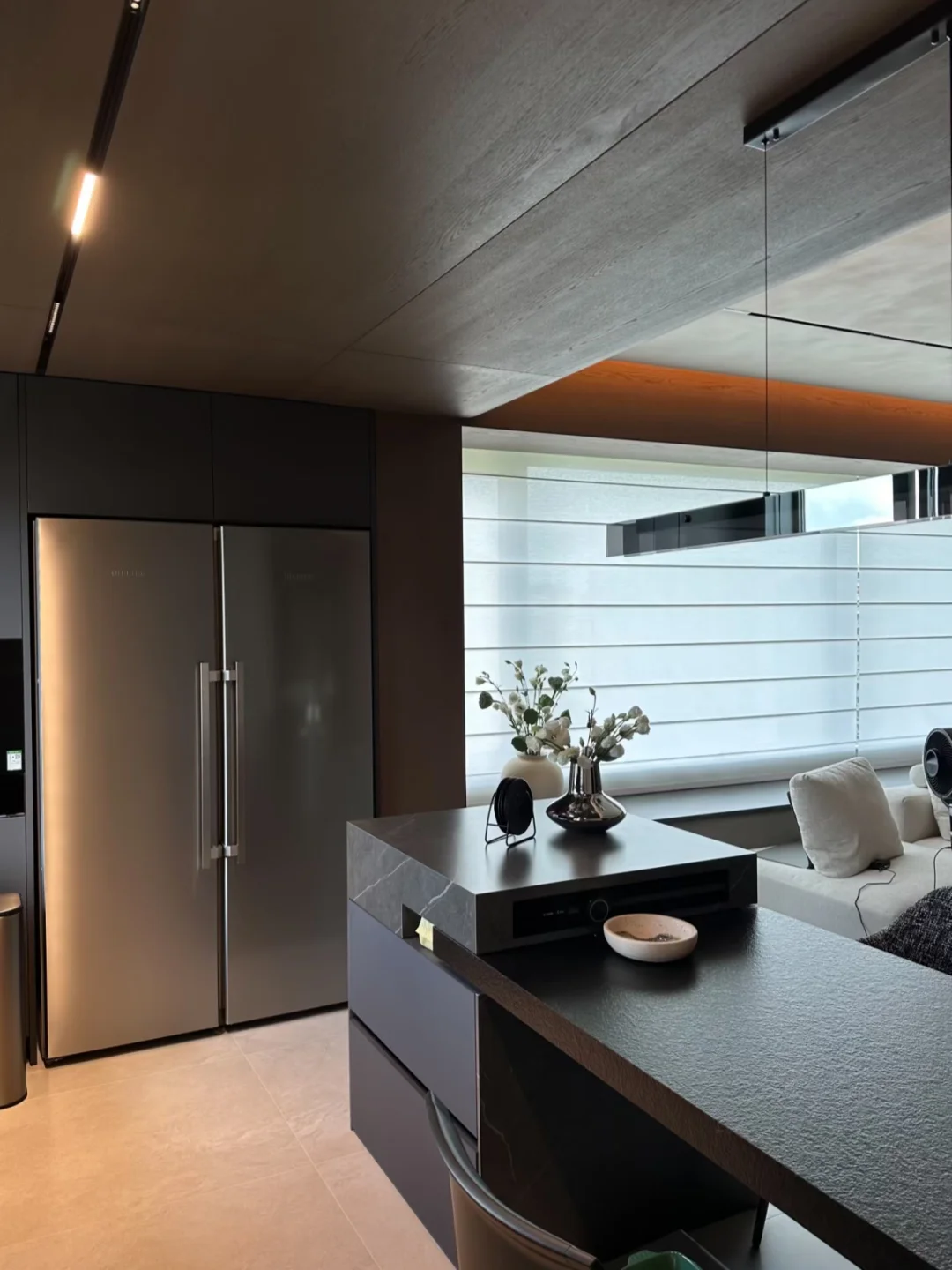 这是一组意式极简的餐厅厨房,窗帘用了罗马帘和黑色铝百叶,意式极简不仅仅是生活里精致和高级,更是营造一种独特的生活方式,一种有温度有格调耐看的居住体验。