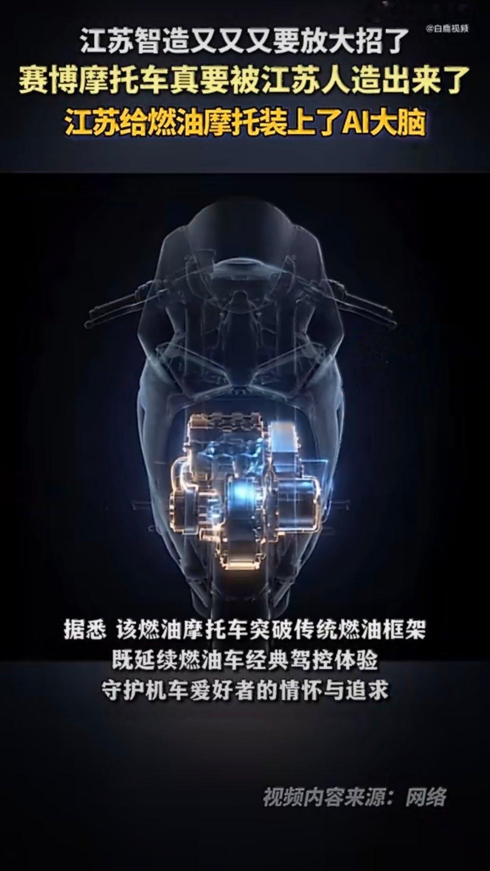 江苏智造又又又要放大招了赛博摩托车真要被江苏人造出来了这个市场会更大,开车通勤其实没有摩托车方便呢!摩托车酷则酷矣,骑行安全应是最高优先级。燃油摩托加AI大脑,情怀和科技两手抓。骑摩托的快乐没丢,还多了智能安全buff,这个量产肯定火,这就是科技赋能生活啊!