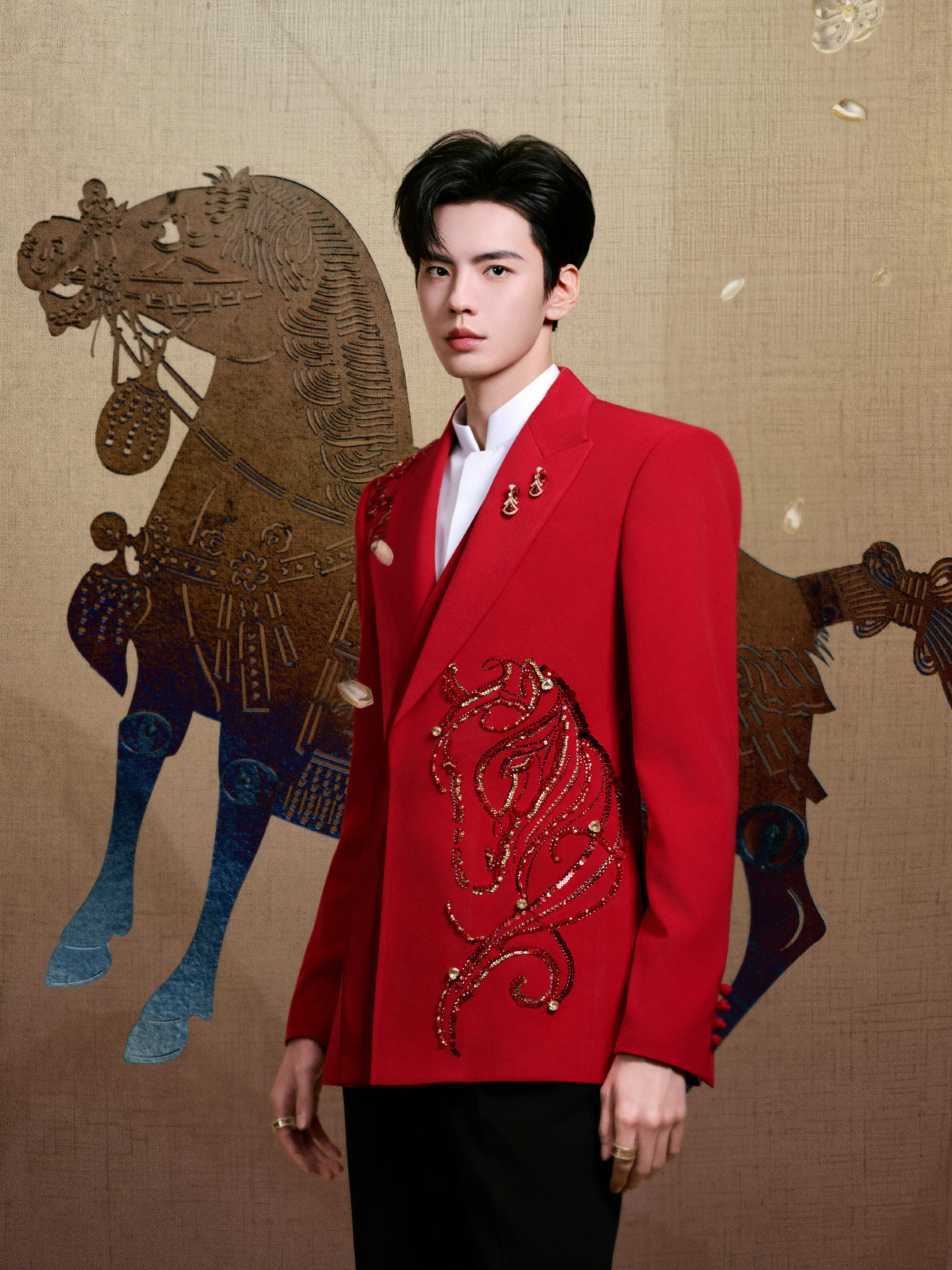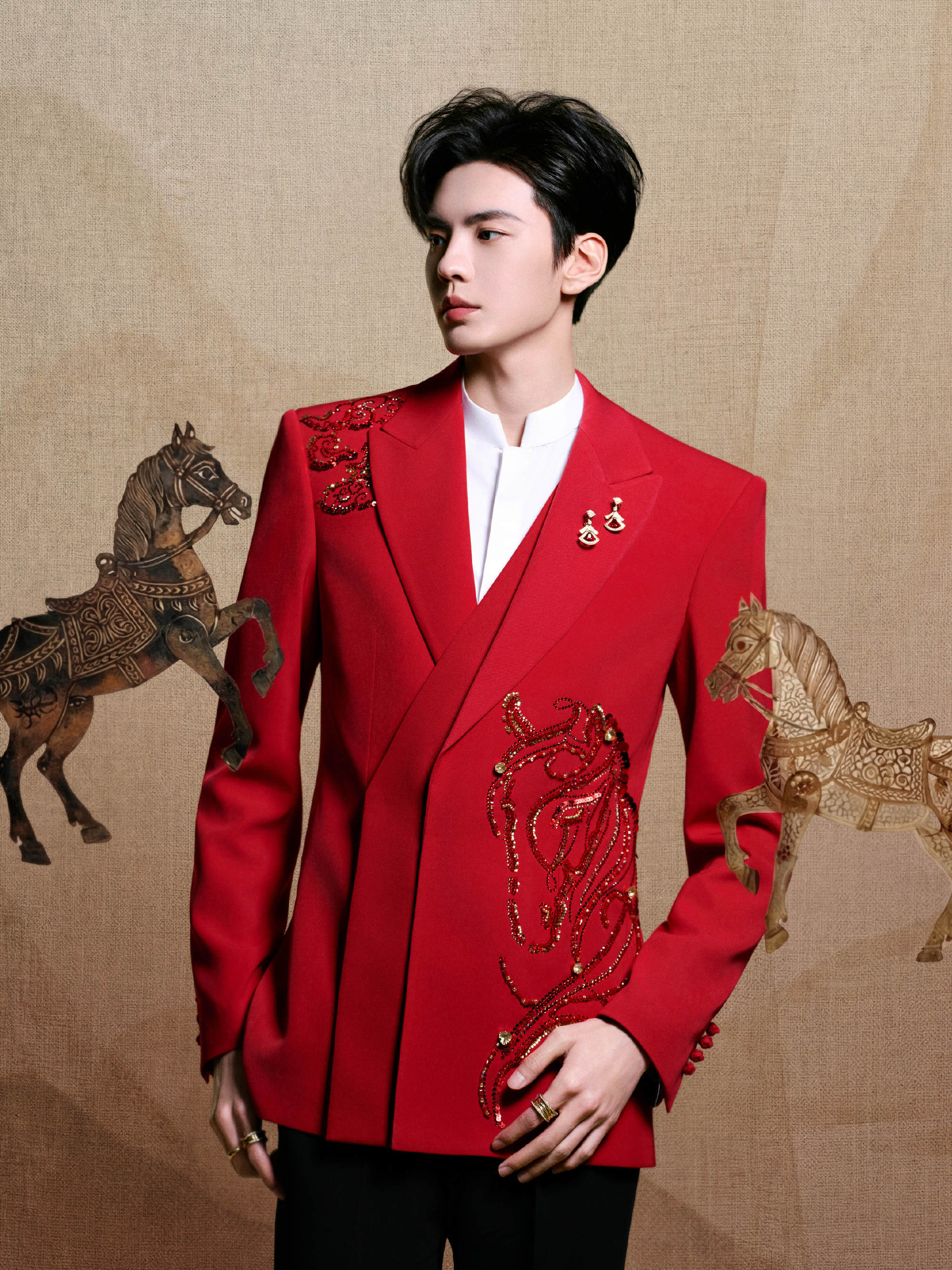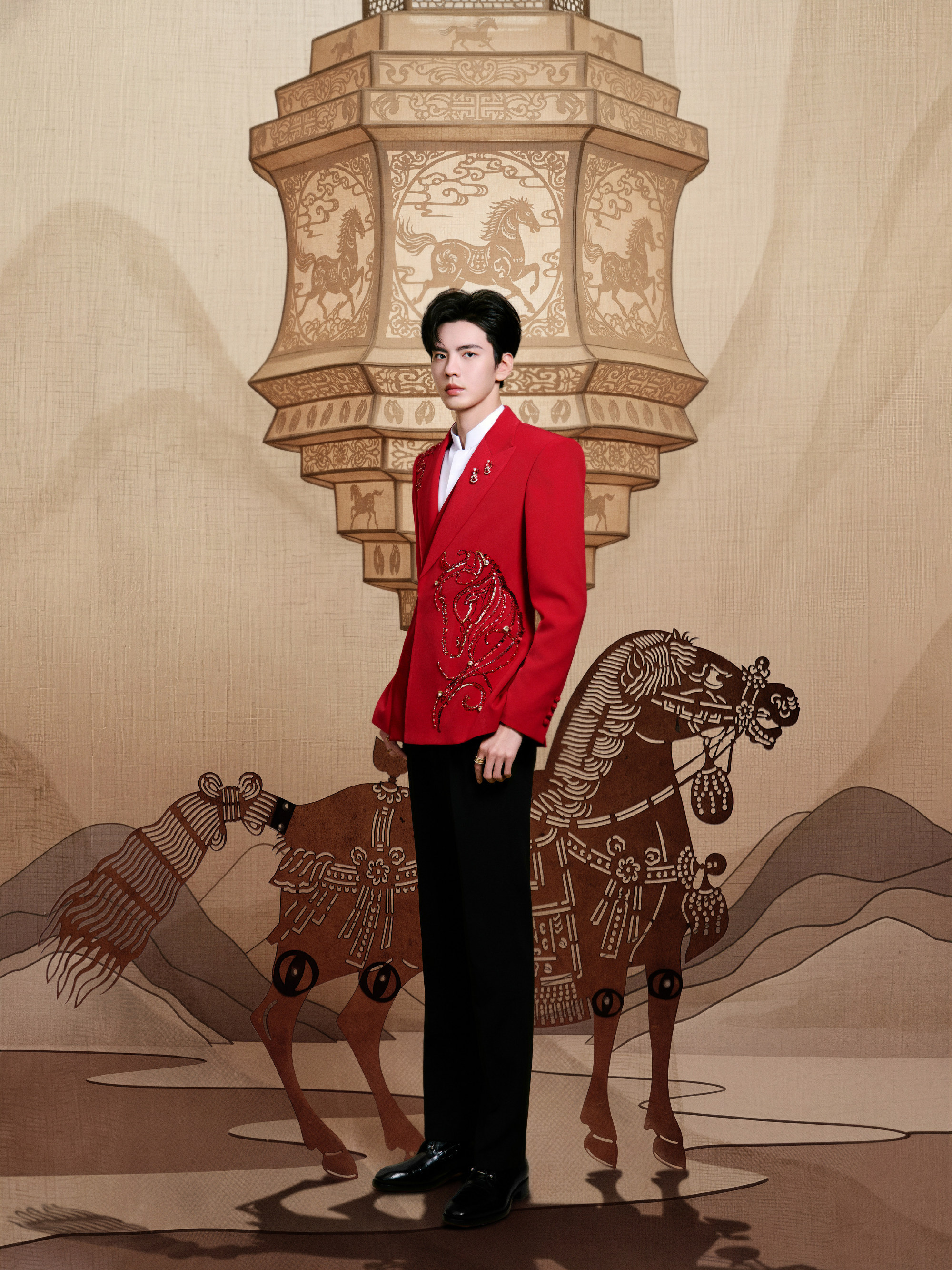 毕雯珺很周正的帅 毕雯珺春晚造型太戳中式审美!红色丝绒西装剪裁利落,衬得身姿挺拔又贵气,黑领带点缀更显俊朗。手持瑞兽花灯立于红门福字间,少年意气揉着新春喜气,氛围感拉满,狠狠期待他今晚在总台春晚的精彩表现!
