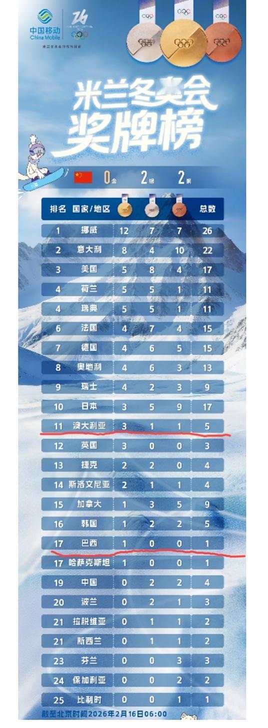 米兰冬奥会金牌榜,看到身处南半球热带雨林的巴西都拿到了一块金牌,同处南半球的澳大利亚更是拿到了三块金牌,网友们真的有点蚌埠住了! 不过,也有部分网友觉得这并没有什么,多拿几块金牌跟我们普通老百姓没有多大关系,我们普通老百姓要的是国运昌荣,国泰民安。再说了,人家地处北欧的芬兰不也是一块金牌没拿到,不是排在我们后面吗?竞技体育都是有一个周期性的,这届差一点,下一届成绩就好了。 就冬奥会夺金这个话题,大家是什么观点?