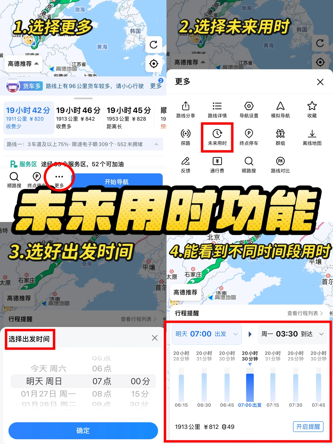 一般来说导航会根据路线每天时间段的路况给你计算未来用时,大部分都比较准,但大雪天气不一定准