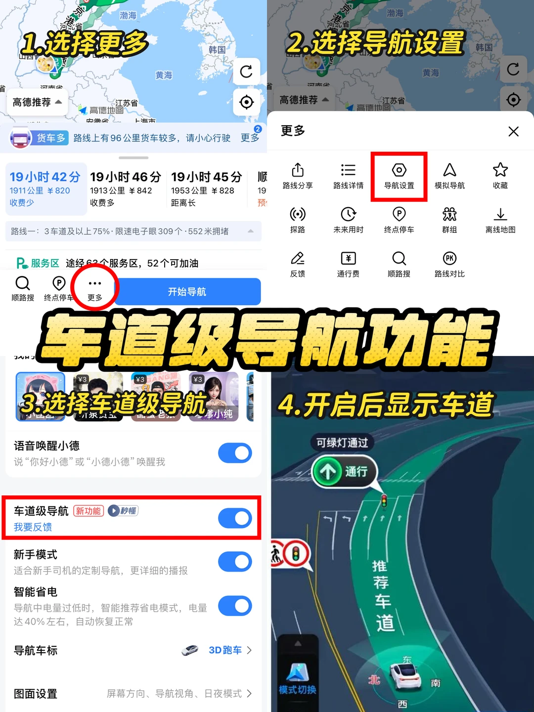 车道级导航可以清楚的显示出现在有几条车道,你应该走第几条,而且可以一键打开或关闭,非常方便