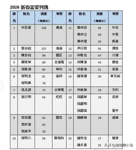 台湾富豪榜出炉!郭台铭痛失首富宝座 林百里身家飙涨登顶台湾首富 2026年农历蛇年收官之际,台湾《福布斯》(Forbes)最新公布的富豪榜榜单揭示了AI浪潮下台湾财富版图的剧烈重构。凭借在全球AI服务器市场的霸主地位,广达电脑董事长林百里以138亿美元(约合新台币4500亿元)的身家,微弱优势力压鸿海创办人郭台铭(137亿美元),时隔多年再度登顶台湾首富宝座。 AI龙头领跑,科技富豪集体进阶 此次榜单的最大看点在于AI供应链的爆发式增长。作为全球AI服务器出货量第一的巨头,广达电脑在AI需求的强劲驱动下,林百里的个人身家较去年增长22亿美元,稳固了其首富地位。 紧随其后的富豪榜前列,同样被科技与半导体领域的领军人物占据。国巨董事长陈泰铭以99亿美元位居第三,台达电创办人郑崇华以89亿美元位列第四。值得注意的是,尽管面临全球关税政策的挑战,“鞋王”宏福实业集团的张聪渊虽身家有所缩水,但仍以84亿美元的资产稳居前五,显示出传统制造巨头在转型与韧性上的实力。 金融世家稳固,张忠谋位列第七 榜单第六至第十名主要由台湾金融与电子产业的重量级人物构成。富邦集团的蔡明忠(81亿美元)与蔡明兴(78亿美元)兄弟分列第六、七位。值得注意的是,台积电创始人张忠谋以75亿美元的身家位列第八,其在半导体产业的泰斗地位与深远影响力依然不可撼动。 此外,旺旺集团总裁蔡衍明(65亿美元)与国泰集团的蔡宏图(64亿美元)也跻身前十,显示出食品快消与金融保险业在财富积累上的稳健性。 蛇年股市狂欢,九成富豪资产增值 回顾刚刚结束的2025年(蛇年),台湾加权指数在封关日(2月11日)大涨532.74点,收在33605.71点的历史新高。受益于资本市场的繁荣,超过九成的上榜富豪资产实现上涨,资金高度集中在半导体、AI服务器及大型金融产业。相比之下,纺织、生技等传统产业则呈现出分化走势。
