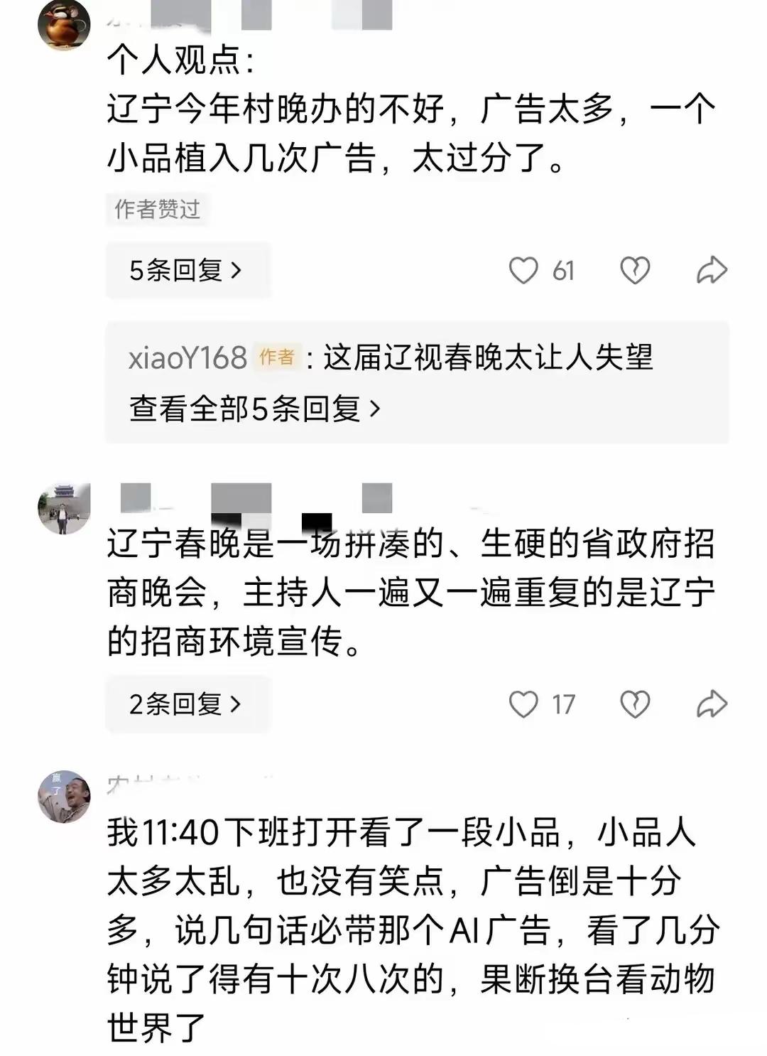 辽宁卫视广告多,说明招商好,广告商认可,收视率高,证明看的人多,传播效果好。有的人,各种吐槽,没意义,没价值,听见蝲蝲蛄叫还不种地了呢!不管你喜欢不喜欢,辽宁春晚都是断崖式第一的存在,有点气人吧。