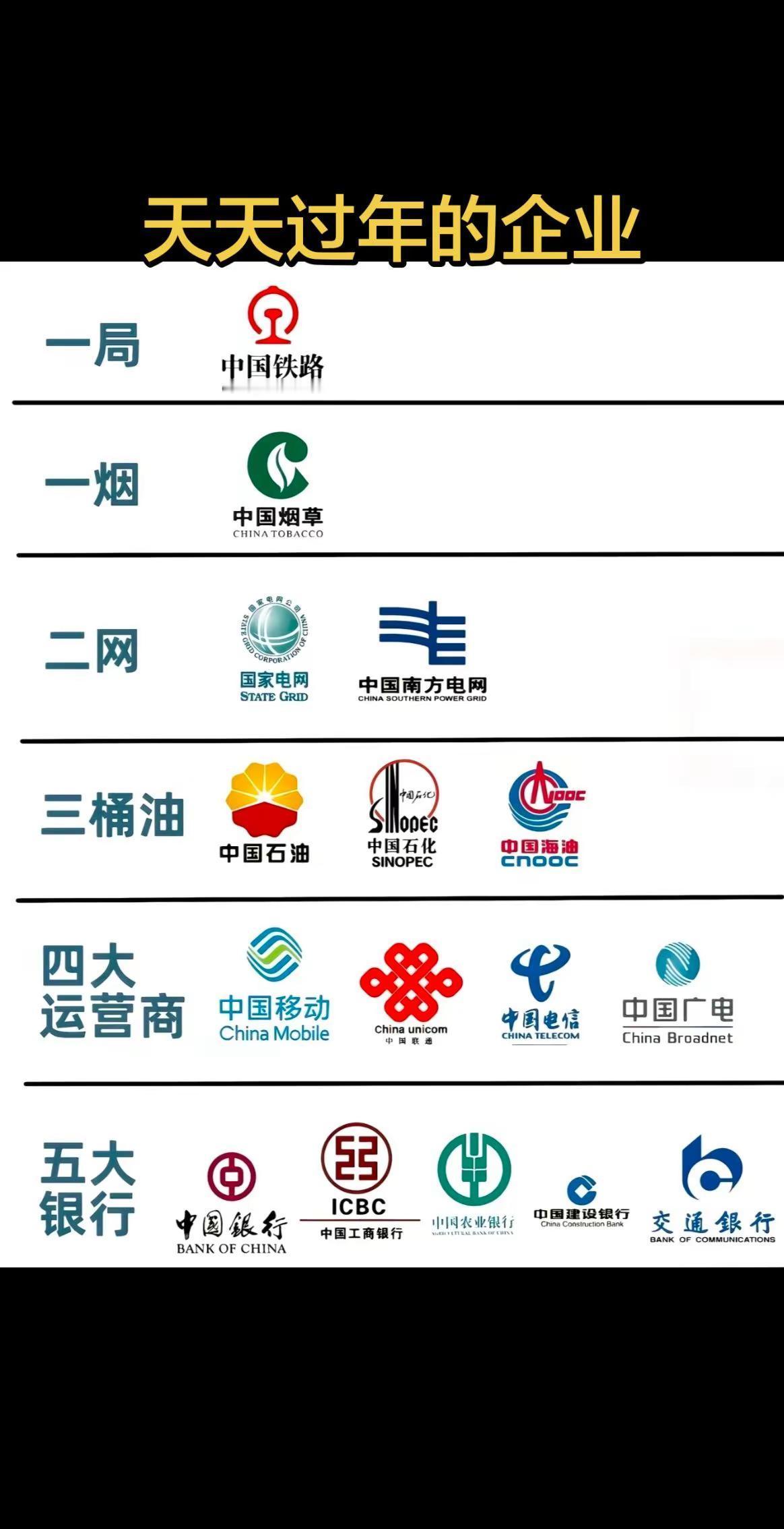 天天过年的企业,一局、一烟、二网、三桶油、四通讯、五银行