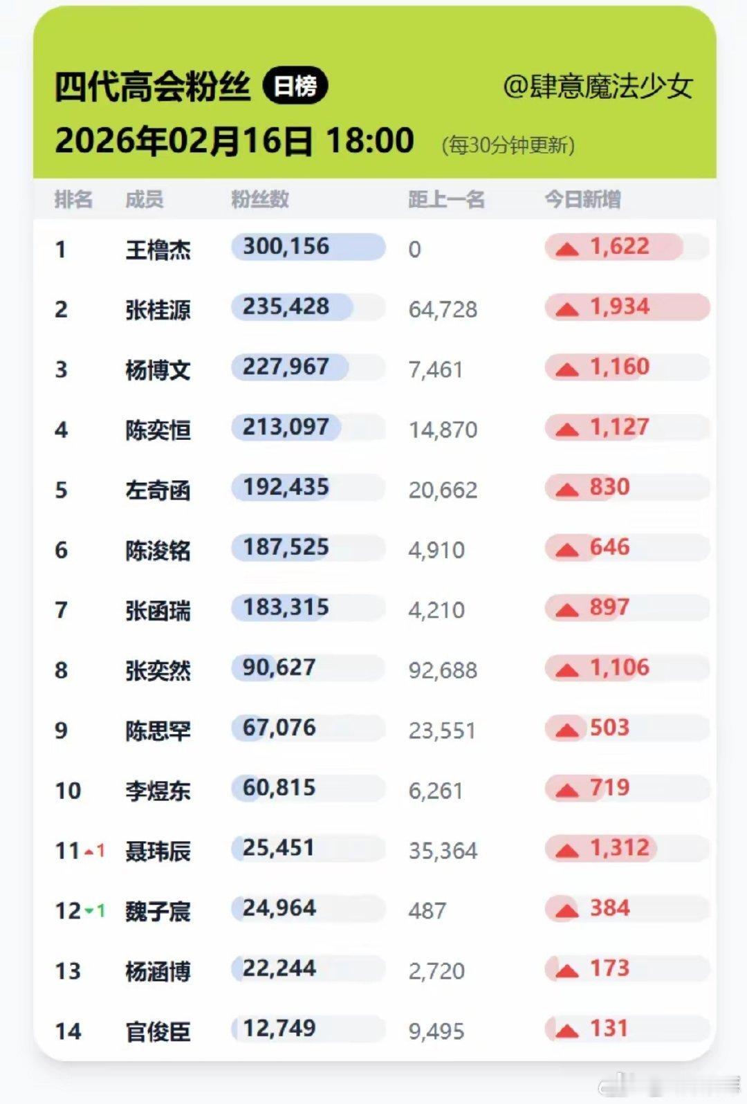 王橹杰的高会粉丝突破30w,是四代里唯一突破25w和30w的,断层的很过分!