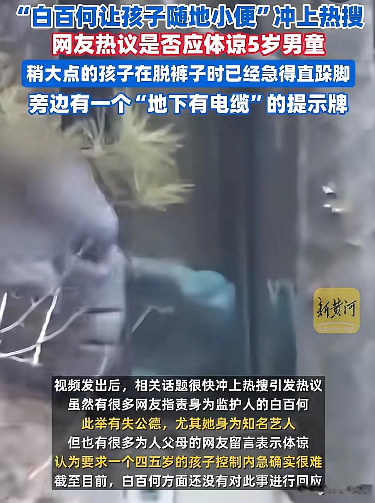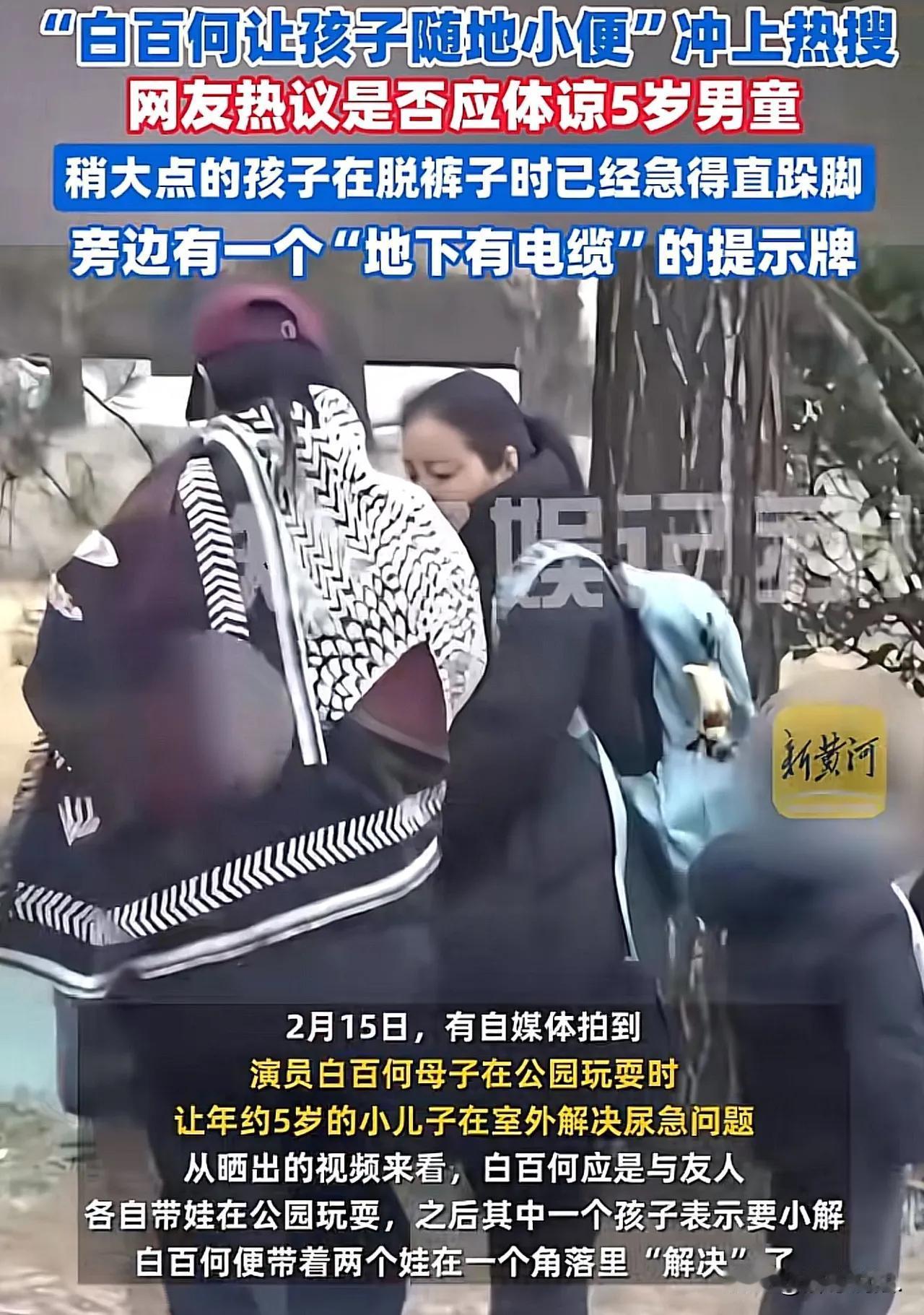 2月15日,白百何因为一泡尿上了热搜。 她和友人带孩子去公园玩,男孩忽然尿急,脱裤子都在跺脚,白百何找了一个隐蔽的角落,让两个孩子解决了内急。于是,“白百何让孩子随地小便“上了热搜。 白百何是名演员,同时也是孩子妈。孩子尿急在偏僻地方方便,已经体现了妈妈的素质。人都有三急,更何况孩子,真没必要上纲上线,虽然旁边有“地下有电缆”提示牌,只要别被电着就行了。 真是奇怪,大街小巷遍地狗屎没人说,小孩在公园角落解决尿急倒上了热搜。这是民众素质高呢还是道德观念扭曲?