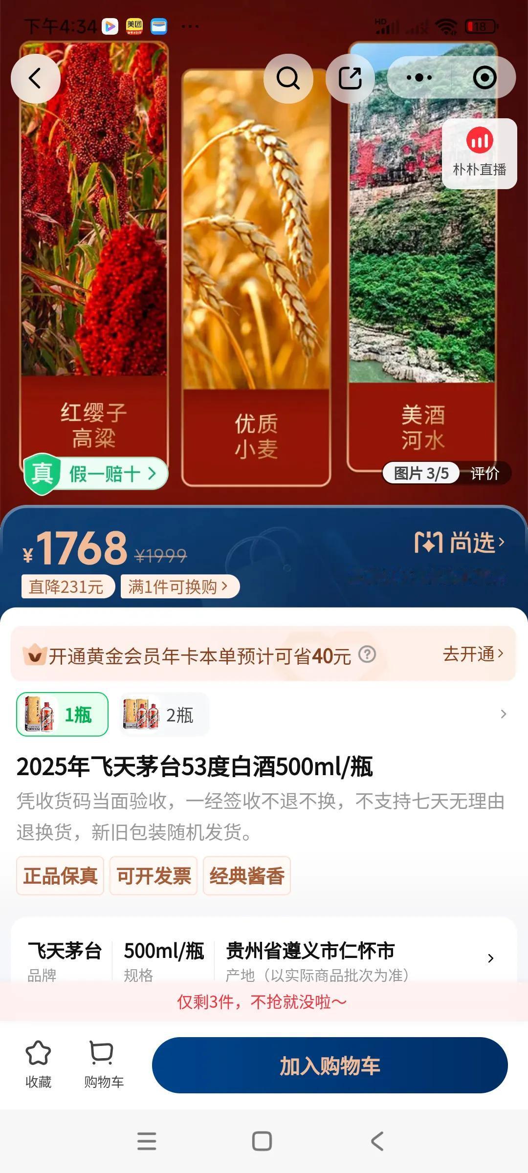 曾经高高在上的飞天茅台,价格降了,1768元一瓶就可以下单了,, 在朴朴超市平台