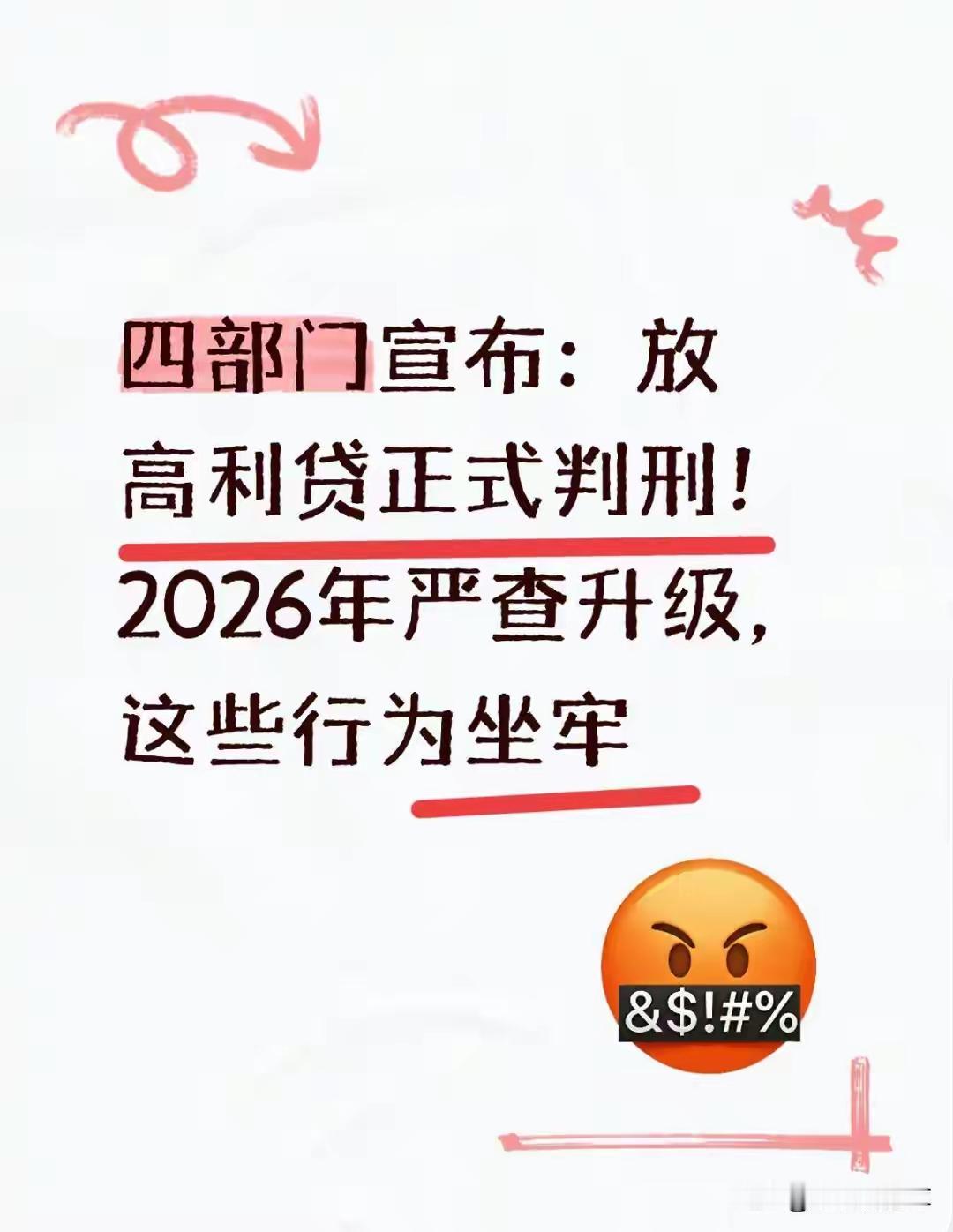 高利贷终于要进监狱了!2026年严打背后,多少人还在刀尖上跳舞? 四部门重拳出击,放高利贷正式入刑!这不是演习,不是预警,而是实打实的法律铁锤。从2026年开始,那些以高息为饵、靠暴力催债敛财的“吸血鬼”,将面临真正的牢狱之灾。 可问题来了,为什么非要等到2026年才严查升级?这些年,多少家庭被高利贷拖垮,多少人因还不上钱走上绝路,相关部门之前都干什么去了? 高利贷这颗毒瘤,早已渗透进社会的毛细血管。它披着“民间借贷”的外衣,干着“合法抢劫”的勾当。月息三分五分是常态,七分八分不稀奇,更有甚者日息高达一毛。借10万,三个月后连本带利滚到20万;借5万,半年后债务翻倍还不够。 那些打着“无抵押、秒到账”旗号的放款者,哪一个不是盯着借款人的命根子下手?更可怕的是,暴力催收如影随形——电话轰炸、上门泼漆、非法拘禁,甚至逼出人命。可偏偏就是这样的暴行,过去却常因“证据不足”“法律模糊”不了了之。现在说要严打,是不是有点晚了? 但这次不一样。法律明确将高利贷与黑恶势力犯罪挂钩,放款者不仅要吐出非法所得,还要面临实刑。2026年严查升级,就是要彻底斩断这条吸血产业链。 可那些至今仍深陷高利贷泥潭的人,是该庆幸迟来的正义,还是痛恨自己当初的侥幸?借钱时只看利息低不低,从不问来源合不合法;签字时大笔一挥,根本不管条款陷阱。当你在赌桌上押上全部身家,在直播间冲动消费,在网贷平台拆东墙补西墙时,有没有想过,那些低门槛的“救命钱”,可能就是把你推向深渊的推手? 高利贷入刑是好事,但比法律更该觉醒的,是每一个普通人的风险意识——天下永远没有白吃的午餐,更没有不劳而获的财富。