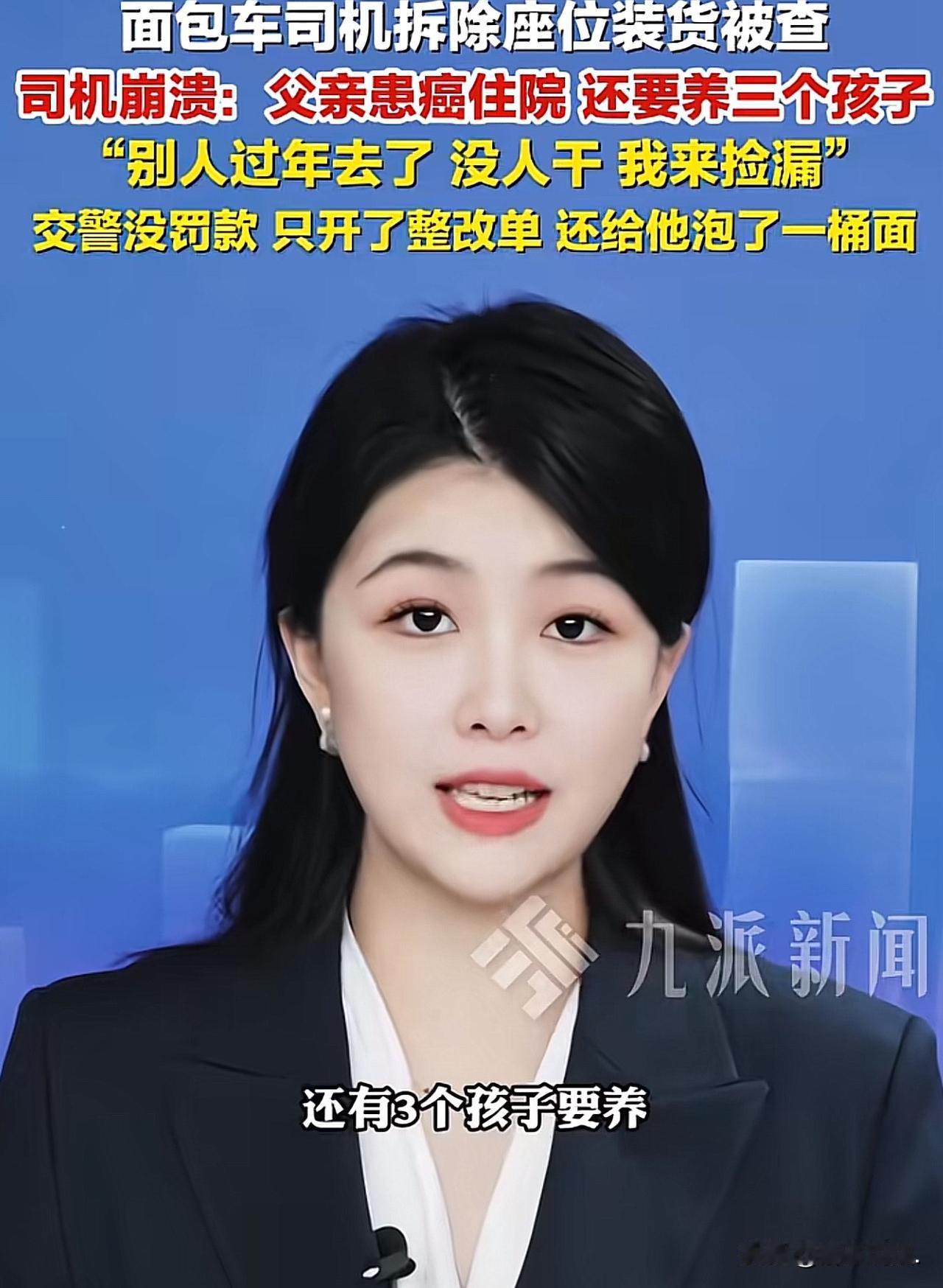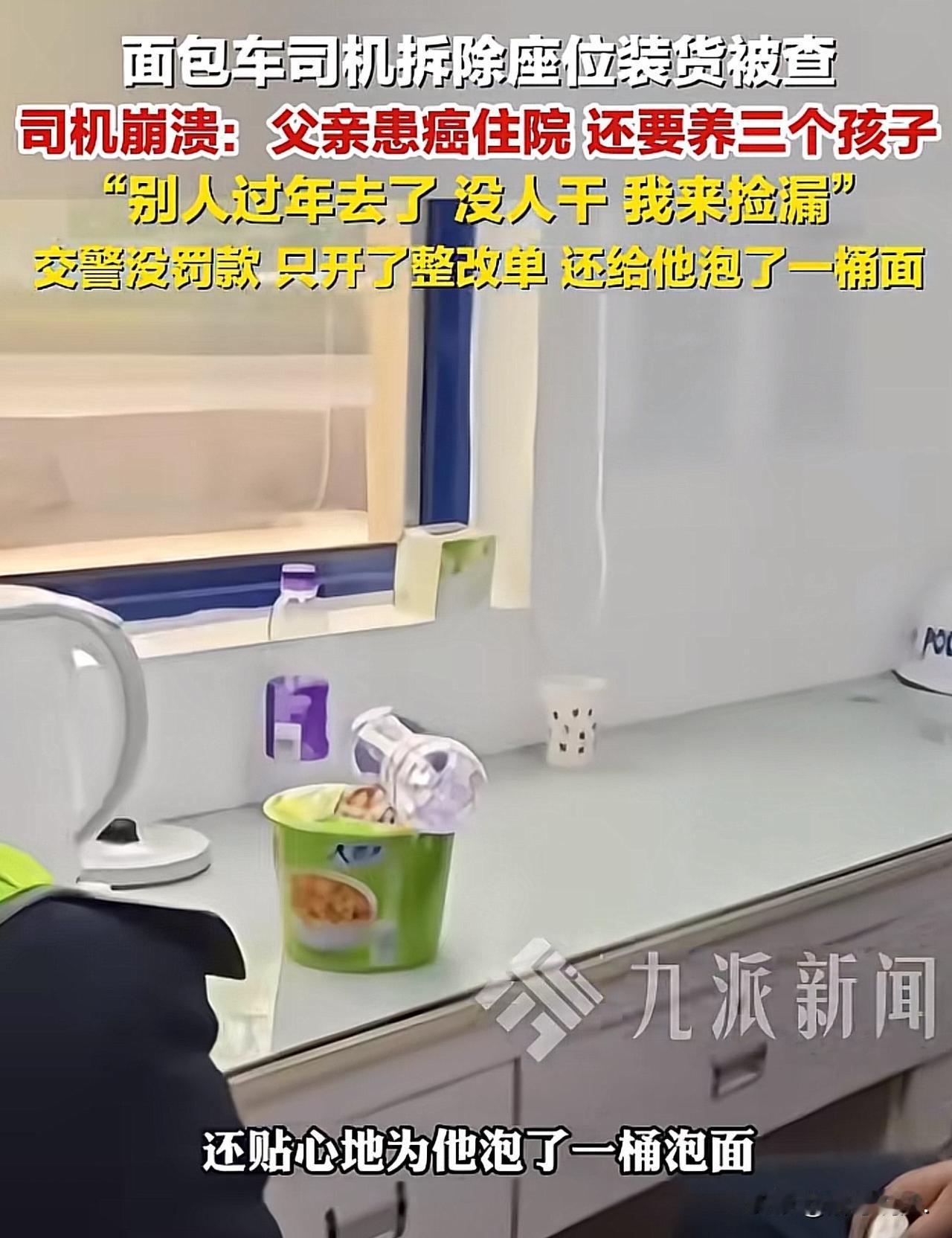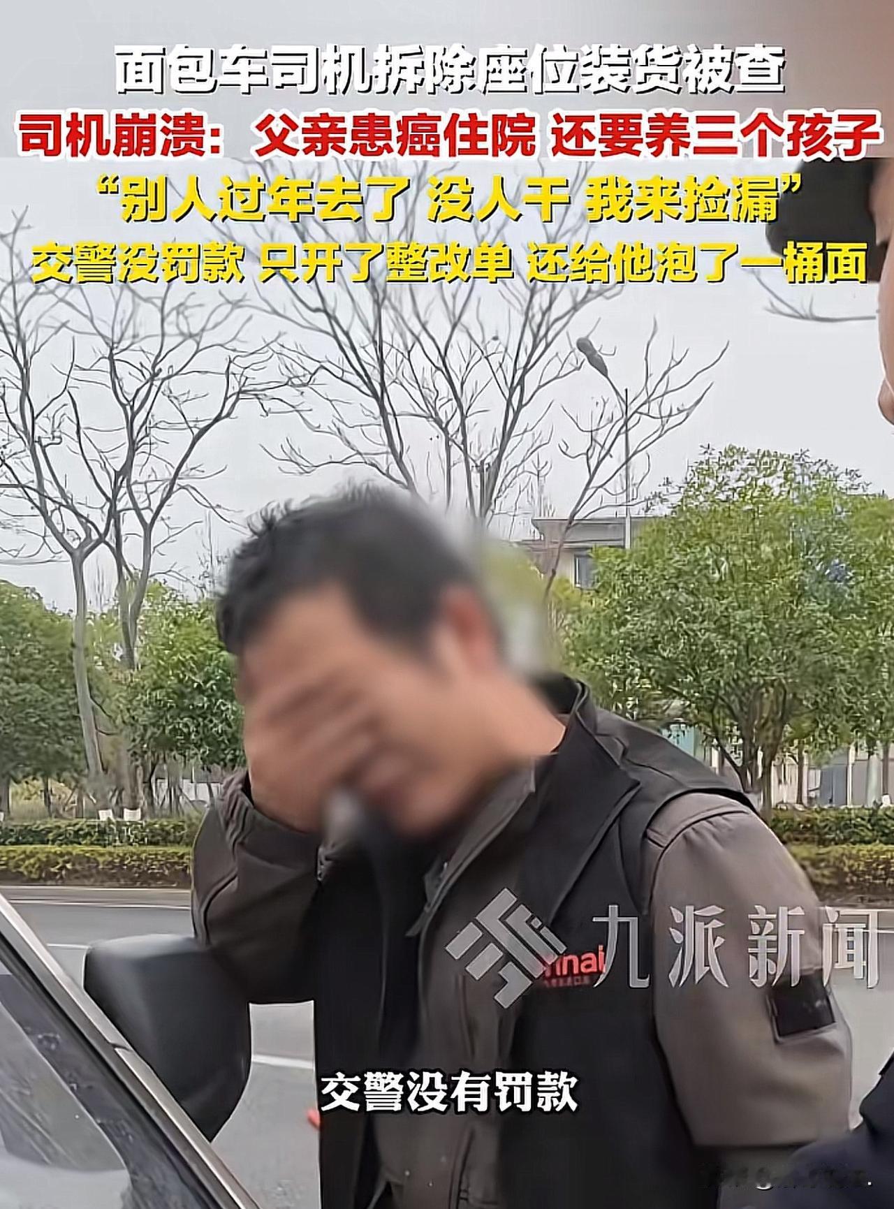 “执法有温度,获赞无数!”湖南长沙,一男子私自将面包车座椅拆除,春节期间用来运输货物。一日,半路被交警拦下,交警告诉他这是违法行为,欲对其进行处罚。男子留下眼泪对交警说,患癌的父亲还在住院,急需用钱,还有3个孩子要养,为了多拉点货,多赚点钱!交警听后,未对其进行罚款,只是默默开了一张整改通知书。在得知男子没吃饭后,又给男子泡了一碗泡面。一摄影师扑捉到了这个画面,并将这段视频发布到了网上。网友:一个有道德的好交警!懂得人间疾苦,知道底层老百姓的不易。 2月15日,一位摄影师拍下的春节执勤视频,悄悄暖了无数人的心。 视频里没有轰轰烈烈的大事,却藏着成年人最不容易的生活,和执法者最柔软的善意。 事情的主角是一位普通的货车大叔,春节本该是一家人团圆放松的日子,他却还在路上拼命奔波。 交警在巡查时,发现他的面包车不对劲,走近一看才知道,车里原本的座椅被拆得干干净净,就是为了能多装一点货,多挣一点钱,而这样的行为,已经属于违规载货。 大叔被拦下来的时候,心里又慌又怕,他不是不知道自己违法了,可生活的担子压得他实在没有办法。 面对交警,这个平日里顶天立地的男人,红着眼眶说出了自己的难处:家里老父亲身患癌症,正躺在医院里等着用钱,医药费像一座大山压着他;底下还有三个孩子要养,吃穿用度、读书上学,哪一样都离不开钱。 他说自己没什么文化,也没有一技之长,找不到轻松又赚钱的工作。 别人过年都回家团圆,他只能趁着春节大家都休息,出来跑一跑、“捡捡漏”,多装一点货就能多挣几块钱,就能给父亲多买一盒药,给孩子多添一点生活费。 说着说着,大叔再也忍不住,眼泪夺眶而出。那是被生活逼到无奈的泪水,是身为儿子、身为父亲,拼尽全力却依旧觉得吃力的心酸。他不是想违规,他只是想让家人活下去、过得好一点,哪怕自己苦一点、累一点,哪怕冒着被处罚的风险,他也别无选择。 这里需要明确,大叔的行为已经触犯了《道路交通安全法》第16条第1项:任何单位或者个人不得拼装机动车或者擅自改变机动车已登记的结构、构造或者特征。面包车的座椅属于车辆登记的固定结构,私自拆除用于载货,既改变了车辆构造,也属于客运车辆违规载货,存在重心偏移、制动受影响等安全隐患,依法可以处以罚款并责令恢复原状。 本以为等待自己的会是罚款和批评,可接下来发生的一幕,却让大叔彻底破防,也让屏幕前的无数网友湿了眼眶。 交警听完大叔的遭遇,心里满是心疼。 他们严格执法是职责,但更懂普通人生活的艰难。 最终,交警没有对他罚款,只是耐心地教育了几句,郑重地开了一张整改通知书,提醒他以后千万不能再这样做,安全永远是第一位的。 更暖心的是,交警看大叔奔波了许久,连一口热饭都没吃上,立马贴心地给他泡了一桶热气腾腾的泡面。 一碗普通的泡面,在那一刻,却成了寒冬里最暖的慰藉。 他们轻声叮嘱大叔,一定要注意安全,好好过年,再难也别亏待自己。 从法律角度来看,交警的处理并非“法外开恩”,而是柔性执法的体现。 法律的核心是保障安全、维护秩序,而非单纯惩罚。 大叔虽有违法事实,但无主观恶意、未造成危害后果,且家庭确有特殊困难,交警以教育整改代替罚款,既坚守了法律底线,又兼顾了人情温度,实现了法理与情理的平衡。 没有冰冷的处罚,没有生硬的指责,只有法理之内的变通,和人心深处的温柔。 这就是最动人的执法温度:规矩是死的,可人是活的;法律有力度,更有温情。 大叔捧着那碗泡面,心里五味杂陈。 生活很难,担子很重,但陌生人的一句体谅、一份善意,却足以支撑他继续往前走。 其实成年人的世界,真的就是这样。 平时再苦再累、压力再大,都能咬着牙硬扛过去,可偏偏在陌生人一句体谅、一份温柔面前,瞬间就破防了。 这位大叔不是不坚强,而是生活的重担早已压得他喘不过气;交警也不是不讲原则,而是他们看懂了一个男人为家人拼命的不易。 法律有尺度,执法有温度,一碗热泡面、一句轻声叮嘱,比任何处罚都更有力量。 我们总在春节里看见团圆的欢喜,却很少注意到这些默默咬牙坚持的普通人。 他们不是不辛苦,只是不敢停下;不是不怕违规,只是放不下家人。 而好在,这世间总有不期而遇的温暖,在你最难的时候,轻轻拉你一把,告诉你:再难,也有人心疼你。 这一幕,没有豪言壮语,却胜过万千祝福。愿每一个为生活拼命的人,都能被世界温柔以待,愿所有奔波皆有回报,所有辛苦终有回甘。