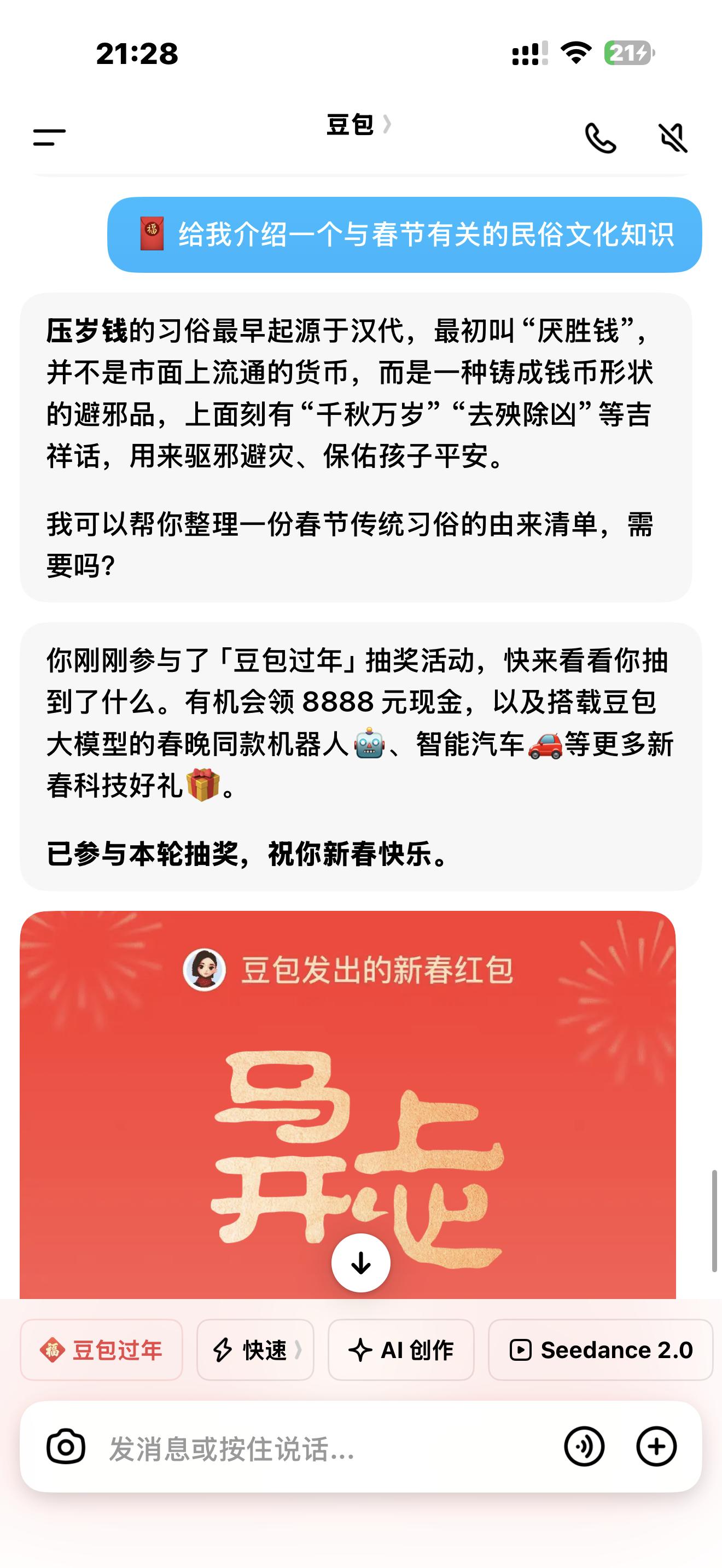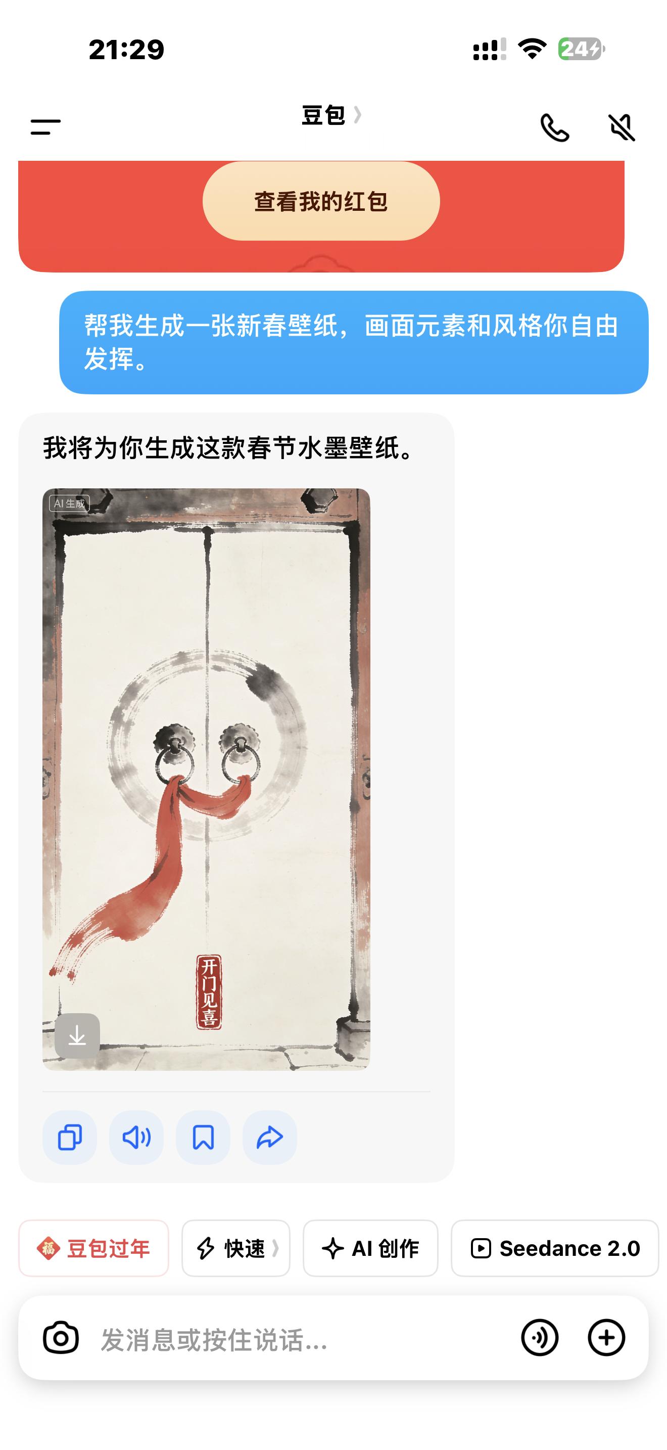 除了答疑,豆包还能陪我玩让它生成一张新春壁纸,水墨风格的“开门见喜”图马上就来了,年味十足,边看春晚边和它互动,感觉年味更浓了。