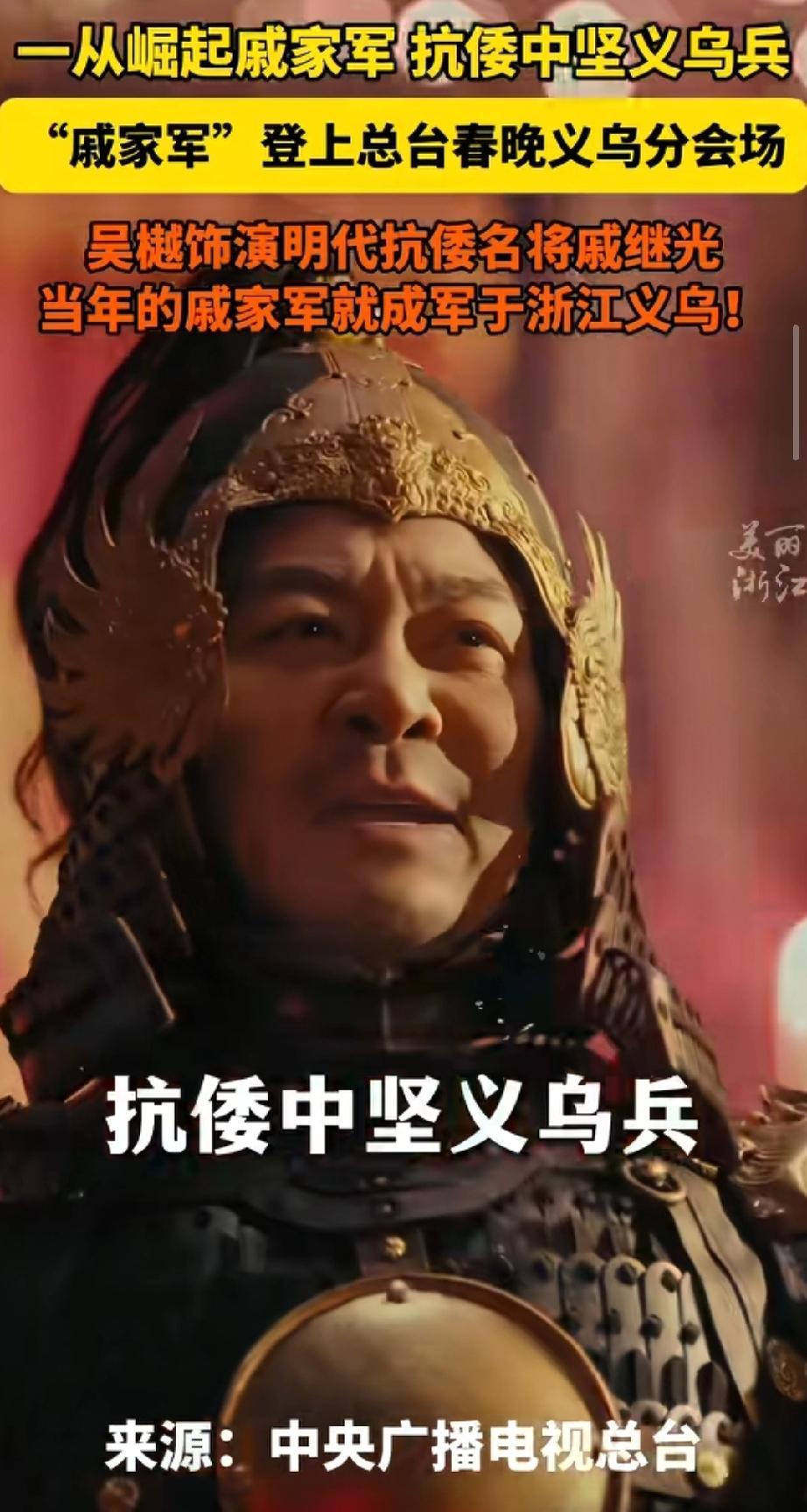 义乌震到我了, 不是宇树机器人的孙悟空,也不是成龙大哥出现,而是吴樾扮演的戚继光,骑着马高声喊出“一从崛起戚家军,抗倭中坚义乌兵”。 这就是义乌会成为分会场的主要原因吧, 戚继光就是在义乌招募矿工、农民,训练出来威名赫赫的戚家军,义乌就是抗倭的核心基地。 “抗倭”这俩字一出,估计小日子又要破防了。
