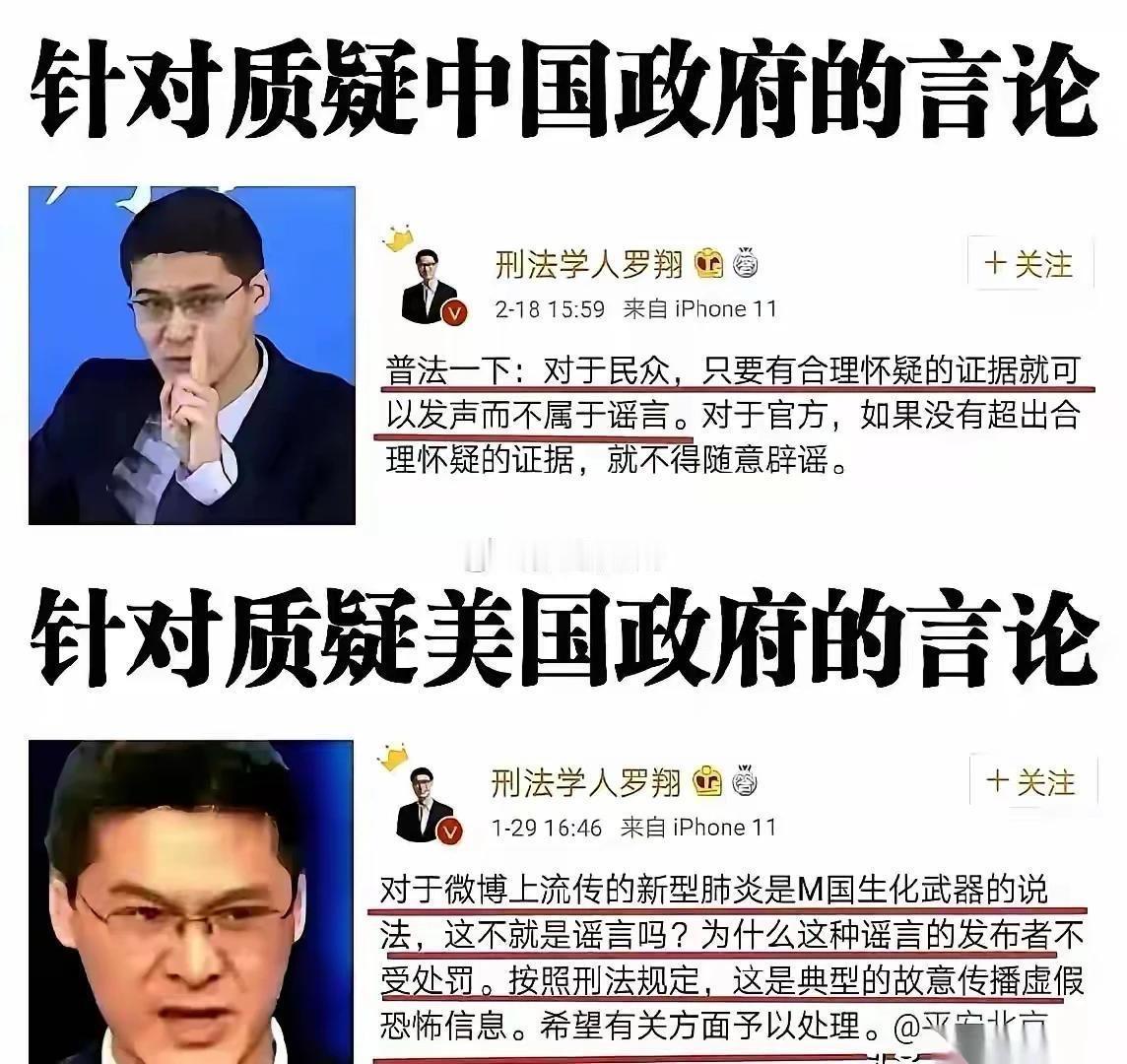 真的太讽刺了!同样是对政府的质疑,罗翔的双标嘴脸暴露得明明白白。 面对质疑中国政府的言论,他说民众只要有合理怀疑的证据就可以发声,不算谣言,官方如果没有超出合理怀疑的证据,就不能随意辟谣。 可轮到质疑美国政府的言论,比如有人说新冠是美国的生化武器,他立刻变脸,直接定性为“典型的故意传播虚假恐怖信息”,还要求有关部门予以处理。 这哪里是讲法律,分明是看人下菜碟。 对中国官方,他要求“谨慎”,对美国官方,他却要求“严惩”。 对质疑中国的声音,他强调“合理怀疑”,对质疑美国的声音,他直接扣上“谣言”的帽子。 这种双重标准,已经不是专业判断的偏差,而是立场选择的问题。 法律本应是一把尺子,量的是是非,不是国籍。 可在有些人手里,法律却成了双重标准的工具,对自己人苛刻,对外人宽容。 我们不反对理性讨论,但绝不能接受这种看人下菜的双标逻辑。 真正的法治,从来不是对不同国家用不同的标尺,而是对所有行为一视同仁,对所有是非明辨到底。 你怎么看这种双标言论?来评论区说说你的看法。