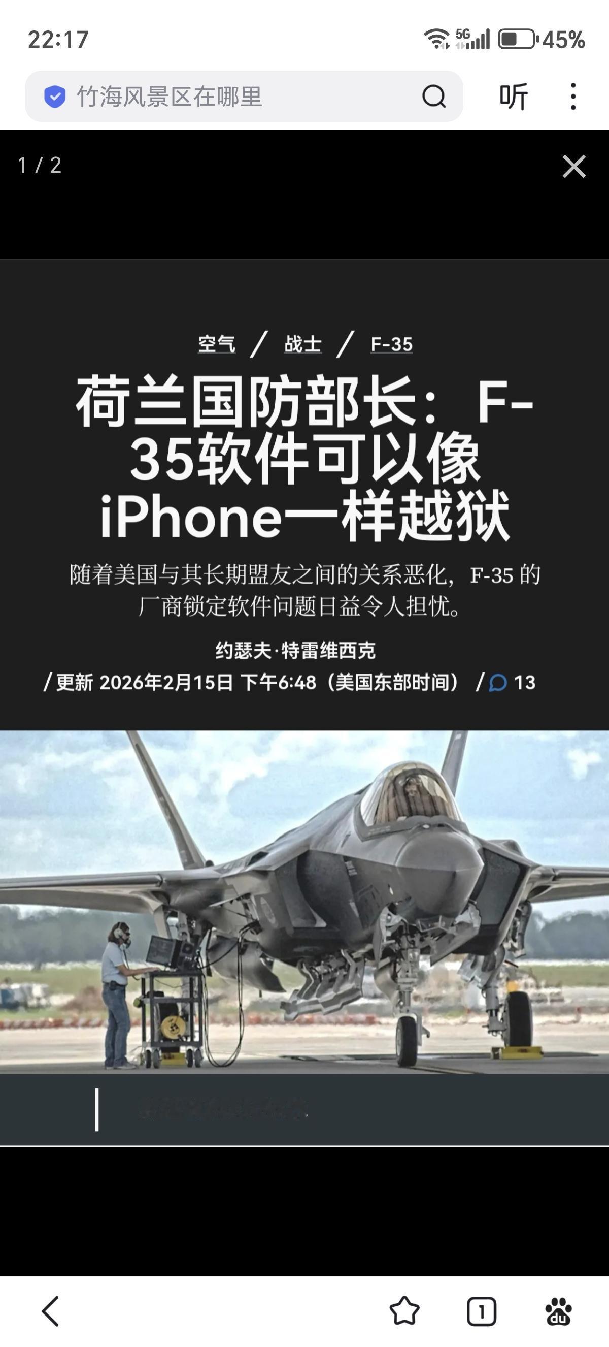 荷兰国防部长说,如果万不得以,可以破解F35的航电软件,像IPHONE一样“越狱”,以解除美国的控制。 TWZ也证实,以色列的F35I是唯一一个安装自己的国产航电软件,并且拥有全套维护升级系统,不受美国人制约操控的F35,只能说爹就是爹。