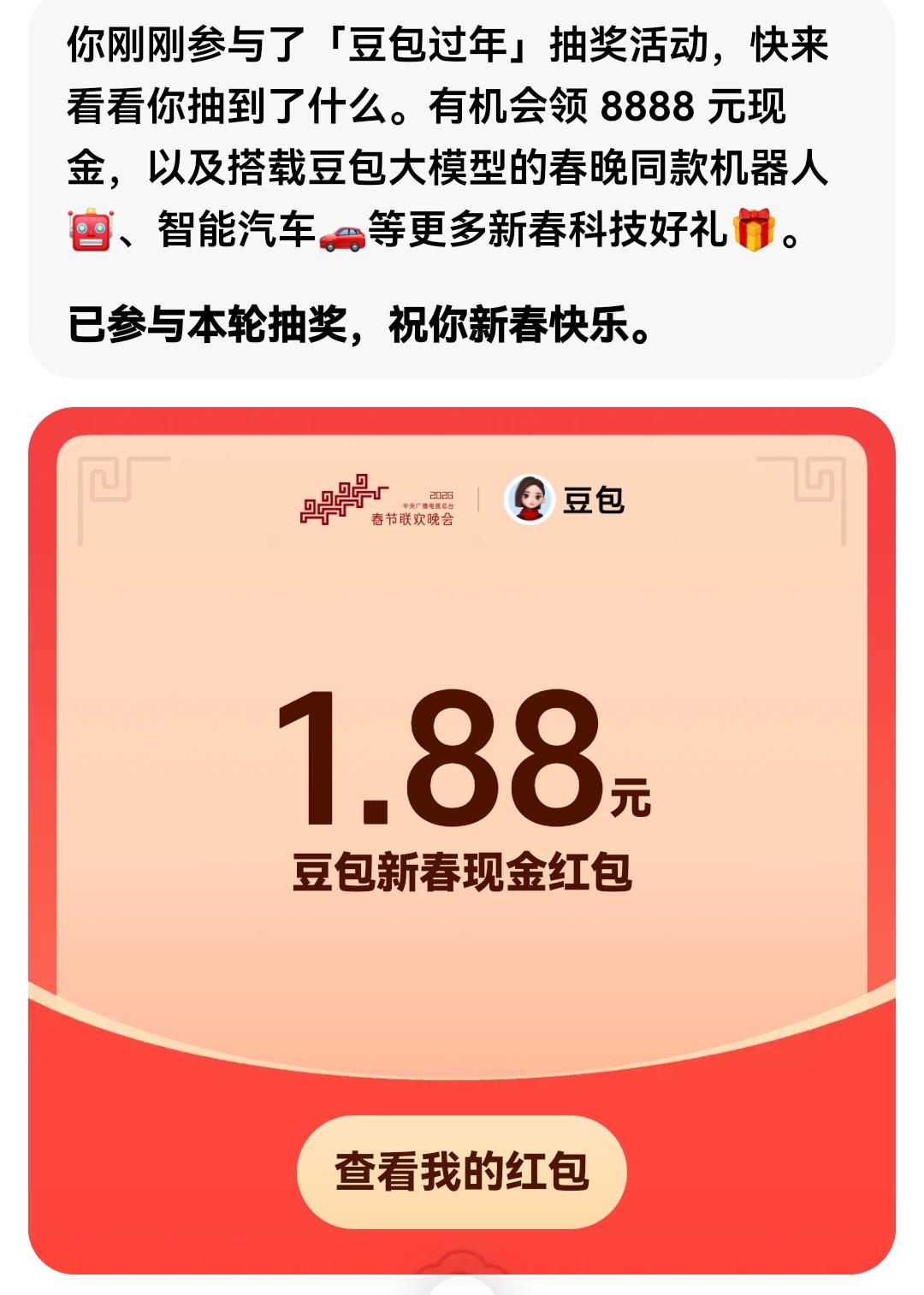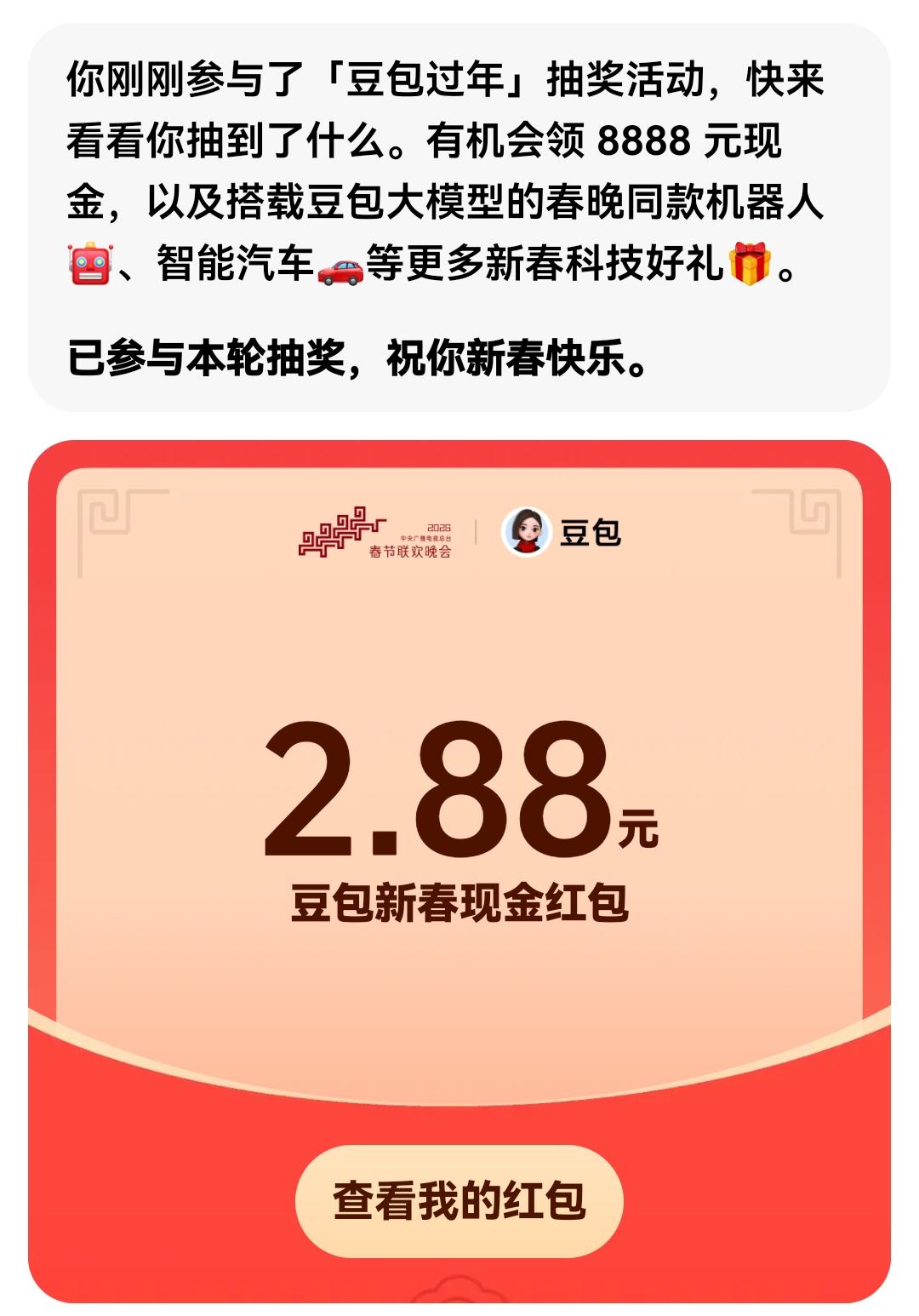 豆包在除夕春晚的三轮抽奖结果,没想到第一轮就抽了个算是大奖吧,非常开心😃。