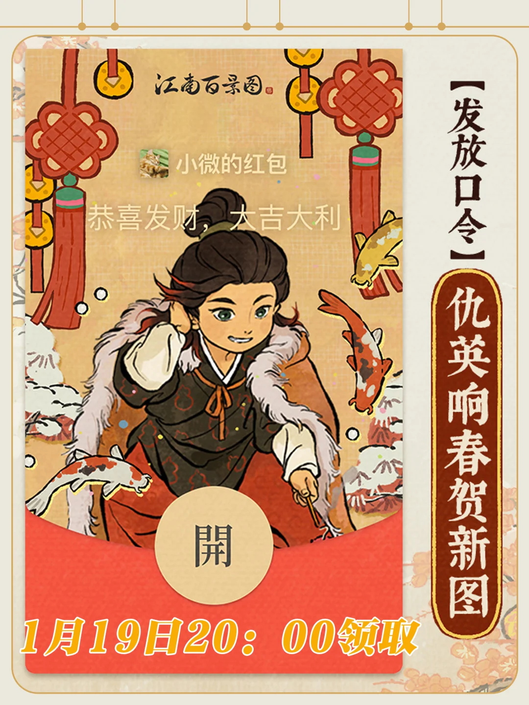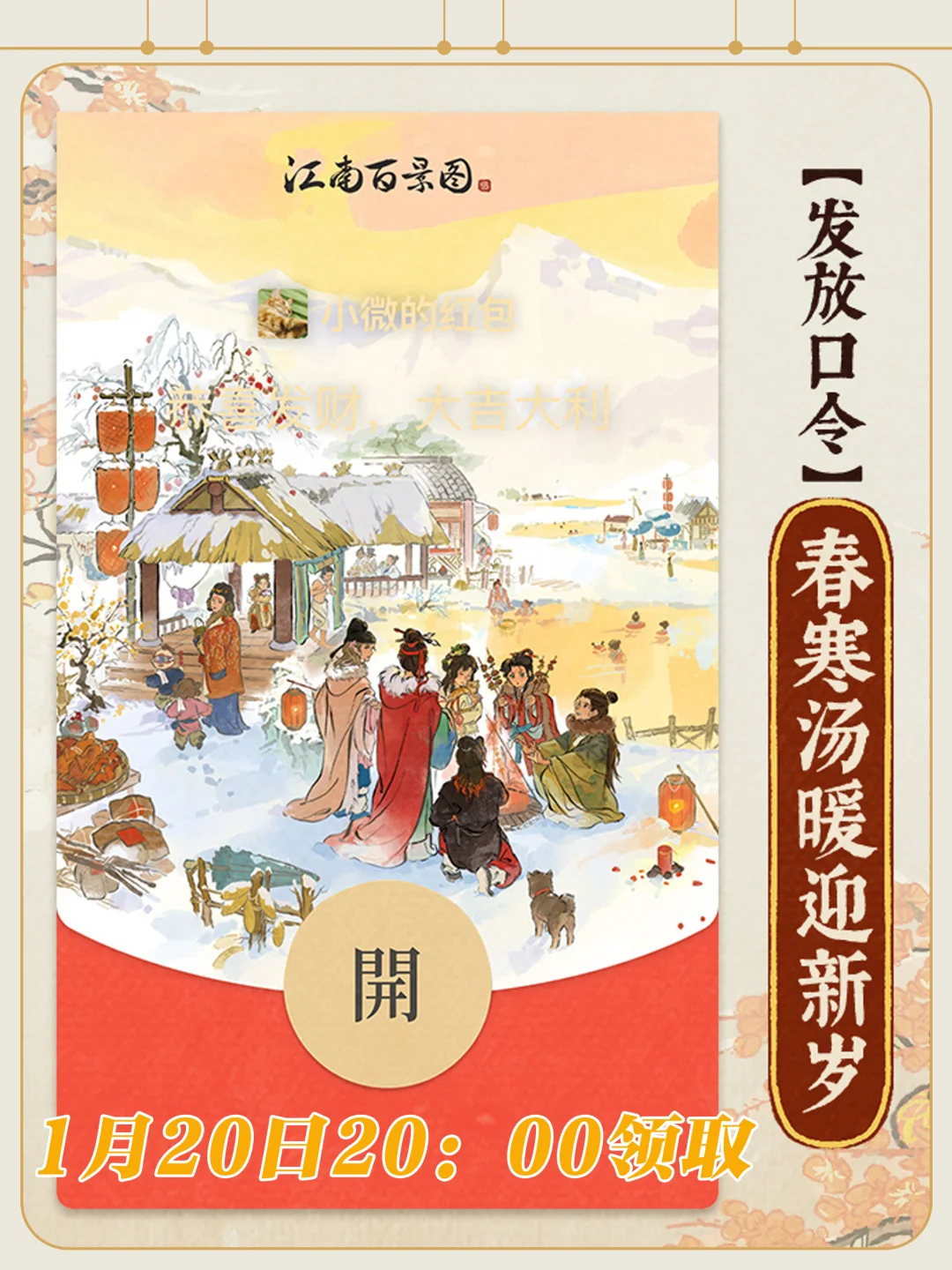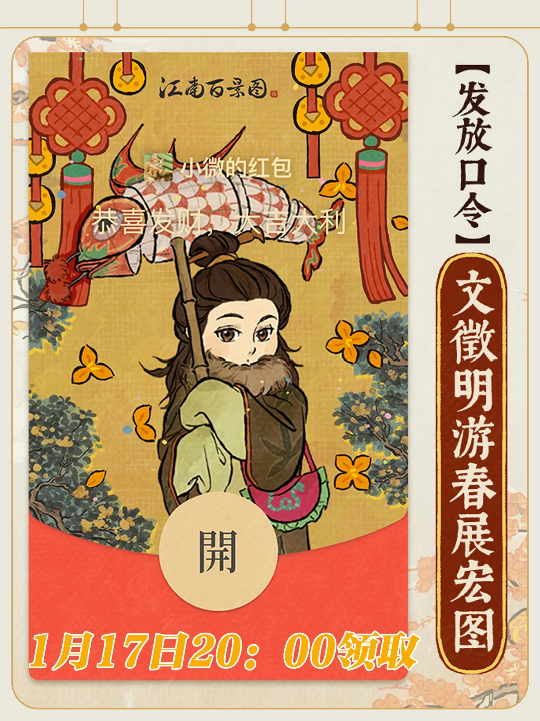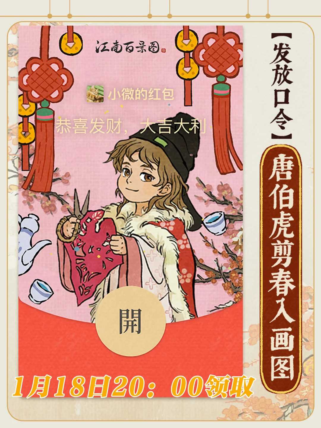 1️⃣1月17日20:00 【文徵明游春展宏图】 2️⃣1月18日20:00 【唐伯虎剪春入画图】 3️⃣1月19日20:00 【仇英响春贺新图】 4️⃣1月20日20:00 【春寒汤暖迎新岁】