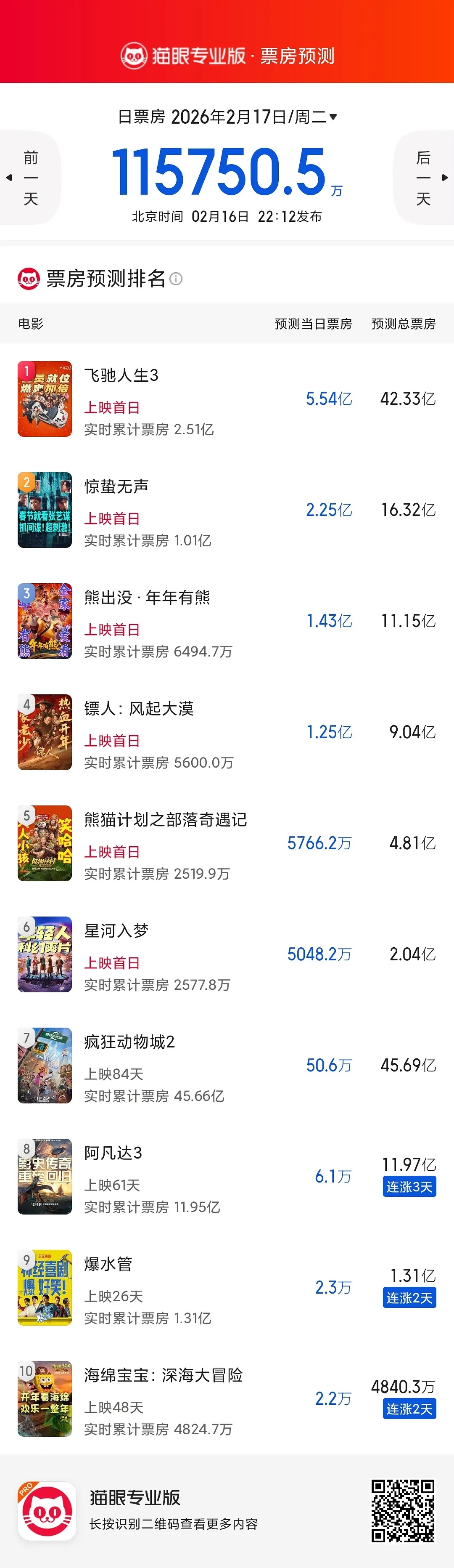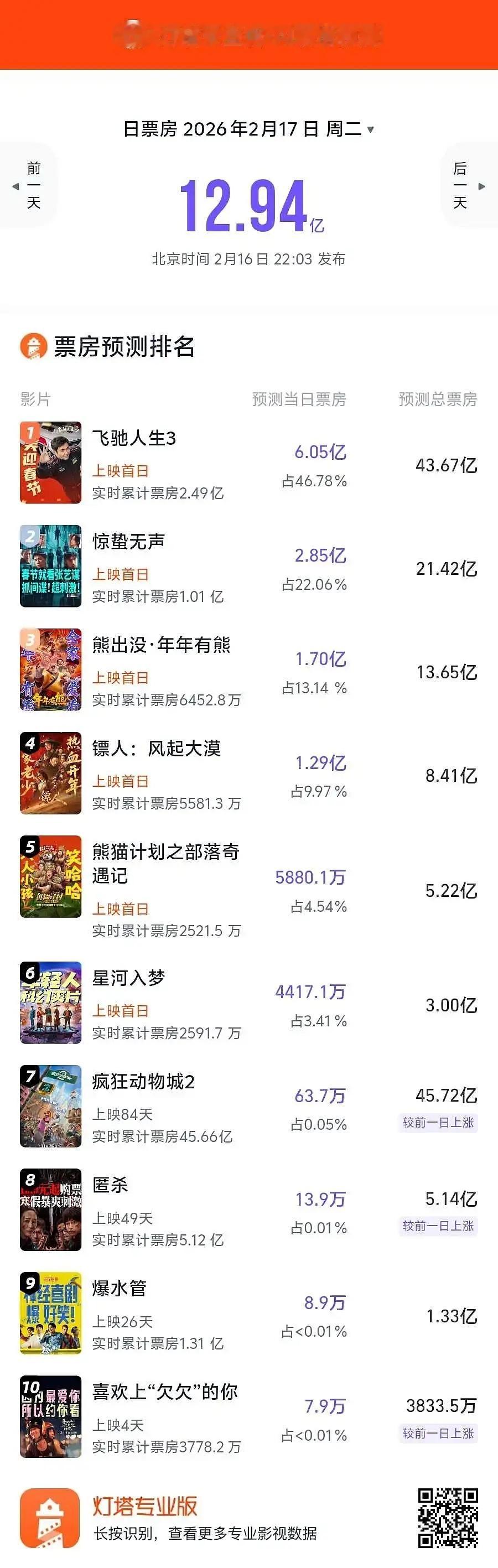 春节档预测飞驰3 猫眼跟灯塔都给40+惊蛰人生 猫眼16 灯塔22熊出没 猫眼11 灯塔13镖人 猫眼9 灯塔8熊猫计划 猫眼4.8 灯塔5星河入梦 猫眼2 灯塔3