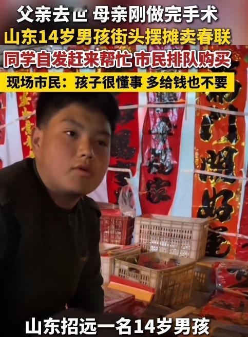 少年摆摊,撑起冬日暖阳 马年春节临近,年味渐浓。山东招远的街头,一个14岁少年却在寒风中独自守着对联摊位,宛如冬日里一抹温暖而坚毅的光。 父亲离世,母亲术后卧床,家庭重担如大山压来。少年没有退缩,选择卖5毛钱一张的福字和几块钱一副的春联,用稚嫩肩膀扛起家庭希望。他每天天不亮就忙碌,双手冻裂仍认真待客。有人想多给钱帮他,他坚决拒绝,称“只收该收的钱”。 他的故事传开后,同学赶来帮忙,市民绕路购买,还有人下了1万元订单。社区和民政部门也介入帮扶。这是少年的坚强,也是城市的温暖。 生活以痛吻他,他却报之以歌。这个冬天,少年如同一束光,照亮街头,温暖人心。你被他的故事打动了吗?快来评论区为他送上祝福,也别忘了点赞转发,让这份温暖传递更远。
