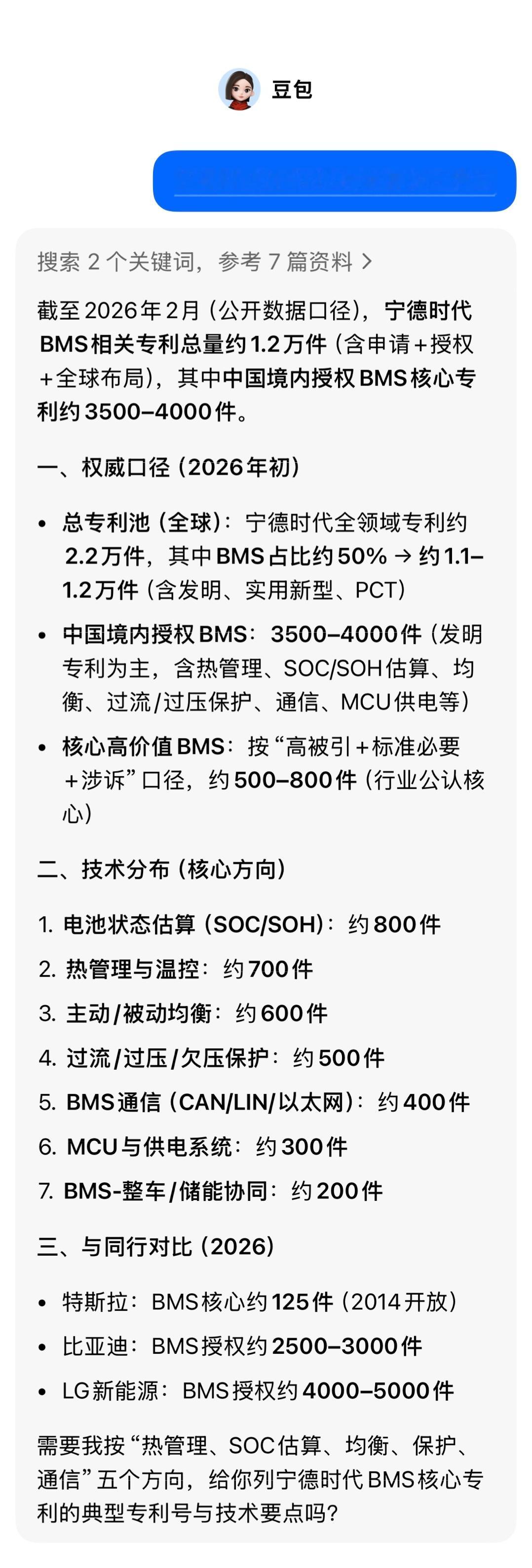 2014年,特斯拉开源了大概200多项专利,我以电池管理系统(BMS)为例,宁德时代拥有相关专利超过1万个,特斯拉开源的BMS专利仅100多个。