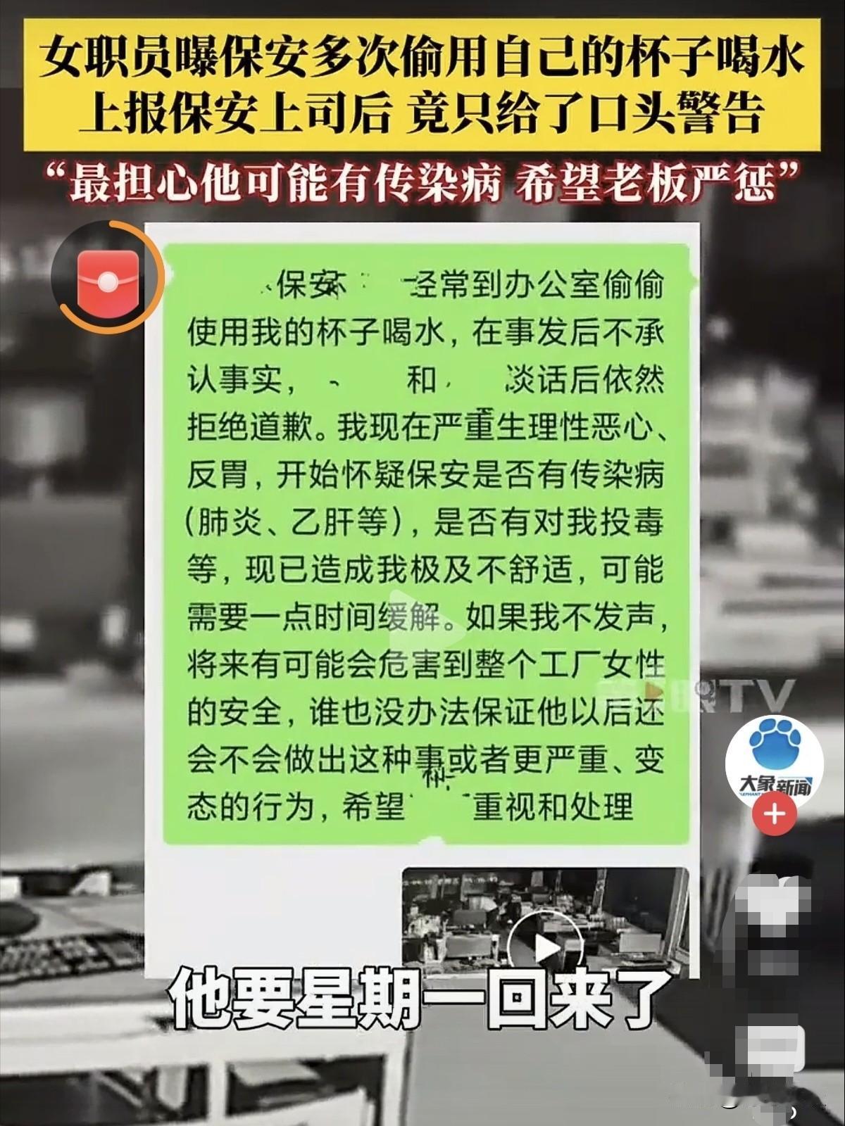 恶心到家了!广东中山,一女子发现水杯被人动过,查看监控发现,公司一男保安,居然天天趁她下班离开后,偷偷溜进办公室,大摇大摆拿起她的水杯直接喝水。看着画面里的一幕,女子当场恶心到作呕,本就又气又膈应,同事一句提醒,更是让她越想越怕。她当即把这事告诉了老板,可老板的处理态度和结果,却让她完全没法接受。 据大象新闻报道,广东的陆姐,最近遇上了一件特别糟心的事。 就因为一个水杯,让她恶心到吃不下睡不着,心里别提多委屈了。 陆姐在一家私企做行政,她工作踏实又认真,对生活也充满热爱。 她有喝茶的习惯,不管多忙多累,她都会为自己沏一杯热茶,生活有甜也有闲。 她特意买了个喜欢的杯子,让自己每天喝水时都心情愉悦。 有天下班,她被临时安排加班复印资料,忙得忘了喝水,直到六点半才急匆匆离开。 结果第二天一到公司,她就发现不对劲,自己的水杯空空的,杯壁还有奇怪的印子。 她清楚地记得杯子里有水,怎么会没有呢?越想越觉得奇怪。 为了发现疑虑,搞清楚情况,陆姐赶紧调了监控,这一看直接把她气炸了,胃里直翻腾。 原来是公司的男保安,趁晚上办公室没人,偷偷溜进来拿起她的杯子就猛喝,几口就喝光了,还抹嘴一脸满足。 她又翻了前几天的监控,更崩溃了,这保安几乎天天来,一天喝好几次,拿她的杯子跟用自己的一样随便。 本来就恶心得想吐,同事提醒了一句“万一他有传染病可咋办”,陆姐瞬间慌了,越想越害怕,就担心自己被传染上病。 她立马拿着监控找领导,希望能严肃处理这个保安。可领导的态度,让她心凉透了。 主管就随便口头批评了保安两句,完全不当回事。 陆姐多次找领导沟通,想让保安调岗或者辞退,领导反而劝她别较真,说怕影响公司评优,话里话外说她小题大做。 有人给她出主意,让公司出钱,安排检查,看看有没有被传染上疾病。 更让人膈应的是,这个保安跟没事人一样照常上班,碰到陆姐还嬉皮笑脸打招呼,一点愧疚都没有。 后来体检结果出来,暂时没什么问题,可医生说很多传染病有潜伏期,让半年后再复查。 这话让陆姐一直提心吊胆,天天睡不好觉,整个人都憔悴了不少。 陆姐觉得,这根本不是一杯水的小事,是自己的健康和尊严被无视。 可在公司眼里,员工的感受还不如评优重要,保安的无礼行为没人管,自己的诉求没人理,这样的处理方式,实在是太让人心寒了。 《民法典》第1165条:行为人因过错侵害他人民事权益造成损害的,应当承担侵权责任。 保安未经陆姐同意,多次私自使用其贴身水杯,属于故意侵害他人健康权的行为。 水杯是直接入口的私人物品,共用存在传播传染病的重大风险。 即便尚未造成实际感染,也已对陆姐造成心理恐慌、精神焦虑。 陆姐有权要求保安赔礼道歉、承担体检费用,若造成精神损害还可主张精神损害赔偿。 公司作为用人单位,有义务为员工提供安全、卫生的工作环境,保护员工的人身健康。 保安长期擅自进入办公室、私用他人物品,公司管理存在明显漏洞。 事发后仅口头警告、敷衍处理,本身就是对员工合法权益的漠视。 对于保安私自用陆姐水杯喝水一事,你怎么看呢? @静心法谈 学法辨是非,慬法不吃亏。