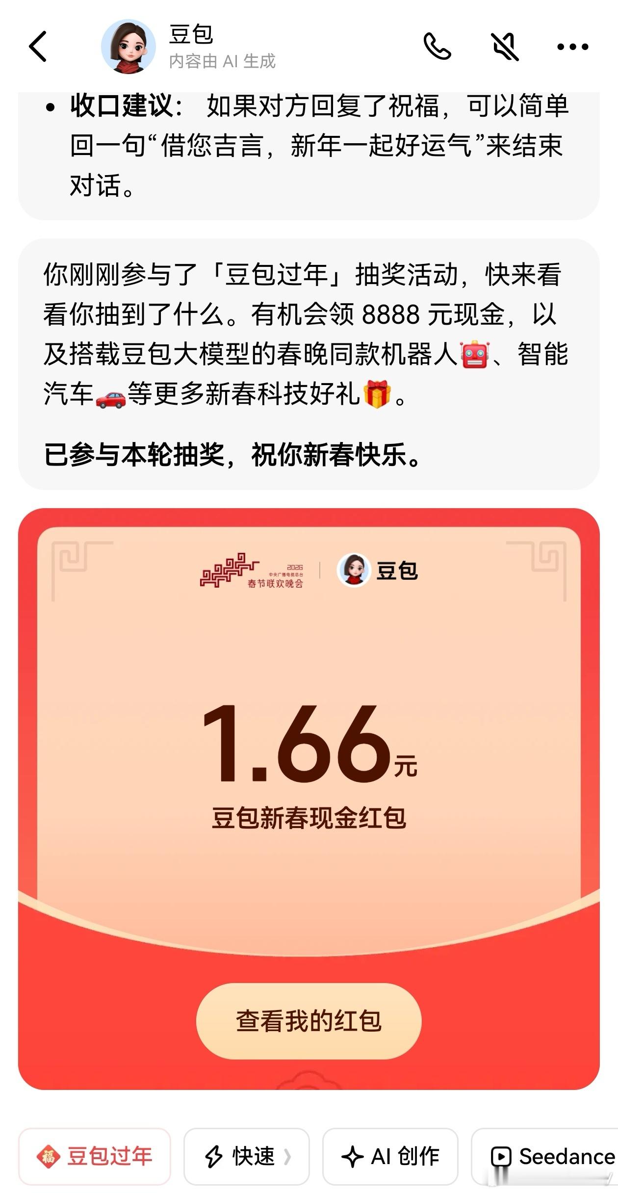 豆包抽奖还是豆包靠谱,最起码能抽到红包,明星红包一个也没有抽到,大家的网速是不是