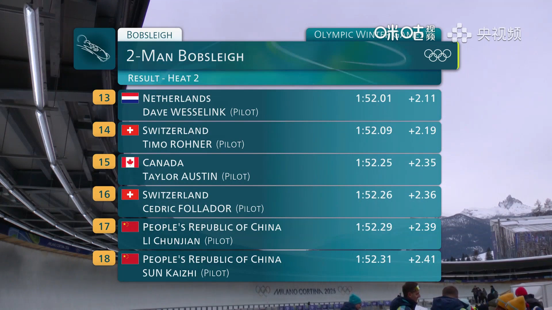 米兰冬奥会男子双人雪车第1-2轮,中国代表团组合孙楷智/安泰两轮成绩为1分52秒31,暂列第18位,另一组中国选手李纯键/叶杰龙两轮成绩为1分52秒29,暂列第17位。