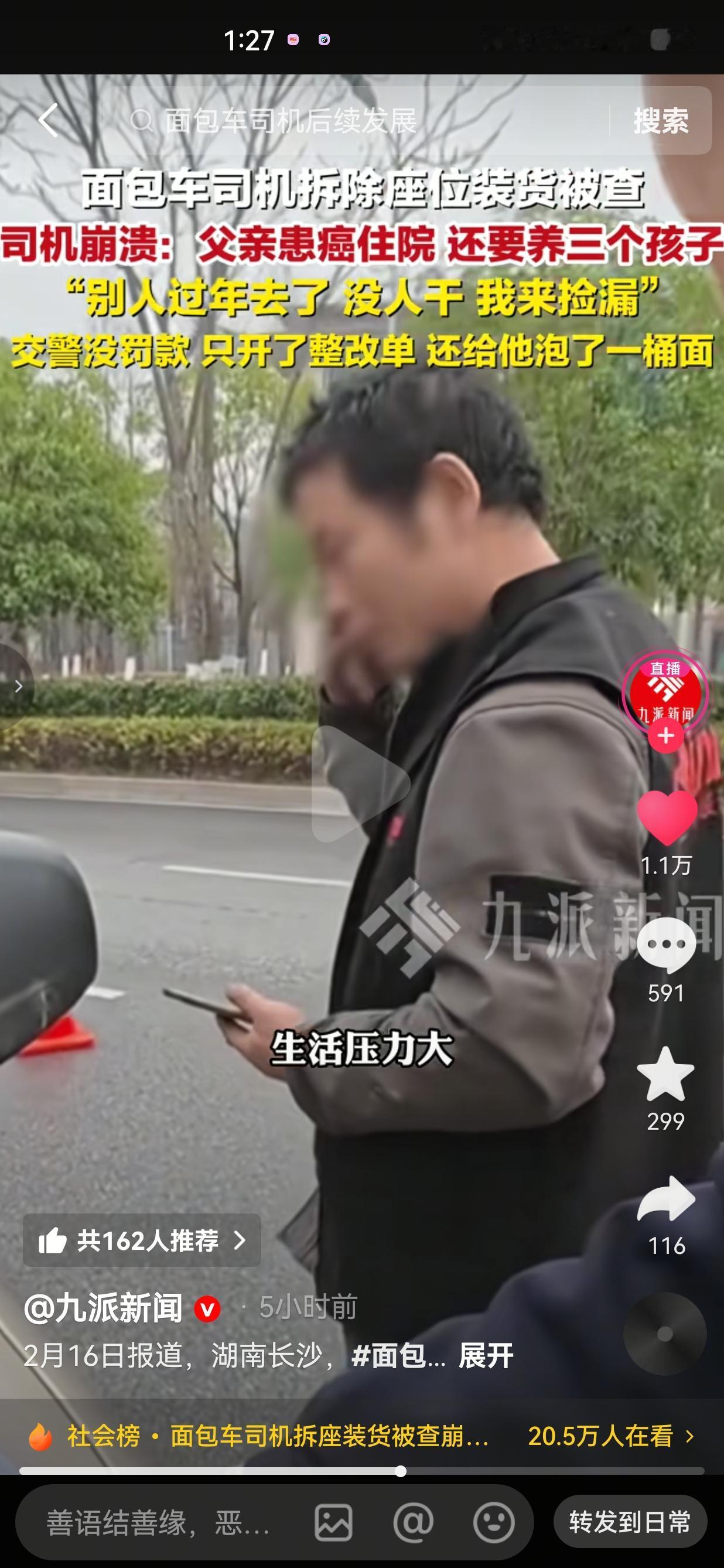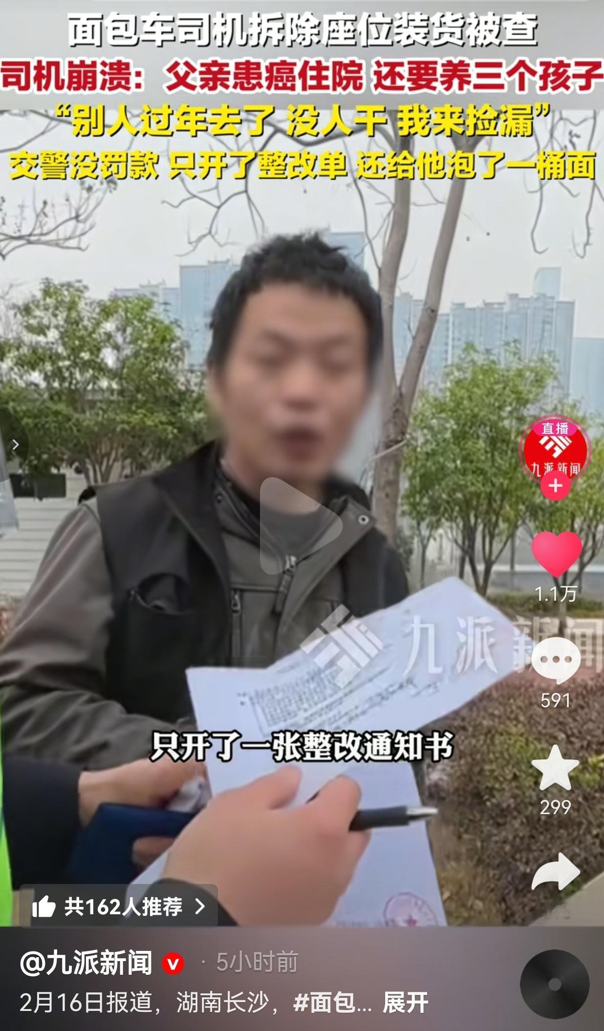 看的人心里暖暖的!这才是执法者应有的温度!2月15日,湖南长沙,一个中年男人在交警面前,哭得像个孩子。 事情是这样的,他开着一辆面包车,被交警拦下检查,结果,却发现车厢里塞满了货。而且,他为了多装一点,多赚一点,竟然把座椅全部拆除了,这属于典型的违规载货行为。 交警问他:“知不知道这是违法的?” 他低着头,声音发颤:“知道。” 交警说:“知道你还干?” 他猛地抬起头,眼泪混着鼻涕往下掉:“我也不想啊……我爸在医院等着用钱,还有三个孩子要养,我自己也没有特殊技能,别人都回家过年了,我出来‘捡漏’拉点货,我没得选啊!”说完,大叔忍不住哭了出来。 此事引发网友的热议,有的网友说:“他明明知道这是违法行为,可是,他还是做了,为什么呢?因为,他知道,家人在等他救命呢。” 也有的网友说:“生活从来不会因为你难,就对你手下留情,但总有人会在你撑不住的时候,递上一碗热面。” 要我说,这个男人,不是什么坏人,他就是个被生活压得喘不过气的普通人。 他知道拆座拉货违法,可他更知道,父亲的化疗费、孩子的学费、家里的柴米油盐,哪一样都等不得。 别人过年是团圆,他过年是抢时间——只有过年的时候,大家都回家了,没人拉货,运价能高一点,他就能多赚一点,给父亲多买一盒药,给孩子多添一件新衣服。 可生活就是这么残酷,你越是想拼命抓住什么,就越容易被现实绊一跤。 他被查了,那一刻,他的心理防线彻底崩了。他不是怕罚款,是怕这唯一的“活路”被堵死,怕自己撑不住这个家了。 好在,交警的做法,暖了所有人的心。 他们了解到大叔还没有吃饭,没有开罚单,只开了一张整改通知书,还贴心地为他泡了一桶泡面,叮嘱他注意安全,好好过年。 交警说:“我们理解你的难处,但规矩就是规矩,整改单必须开。这桶面,你先垫垫肚子,生活再难,也得吃饱了再扛。” 男人捧着那桶面,眼泪又掉了下来。这一次,不是绝望,是被人看见、被人理解的委屈和温暖。 我们总说成年人的世界没有容易二字,可谁不是一边崩溃,一边咬牙硬扛呢? 这个男人,他不是英雄,他只是一个想让父亲活下去、想让孩子吃饱饭的普通人。他的崩溃,不是软弱,是一个父亲、一个儿子,对这个家最深沉的责任。 而交警的那桶热面,也让我们看到了执法的温度——法律是冰冷的,但人心是热的。他们守住了规矩,也守住了一个男人的尊严和希望。 针对此事,你有什么看法呢?欢迎评论区讨论留言。