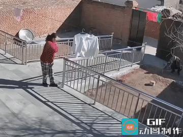 女子有先预判到有危险,先行躲避; 男子也知道了不妙,跨栏动作也真的利索。 最终,院子那两件白衣服承担了一切…… 这比电视真实多了!