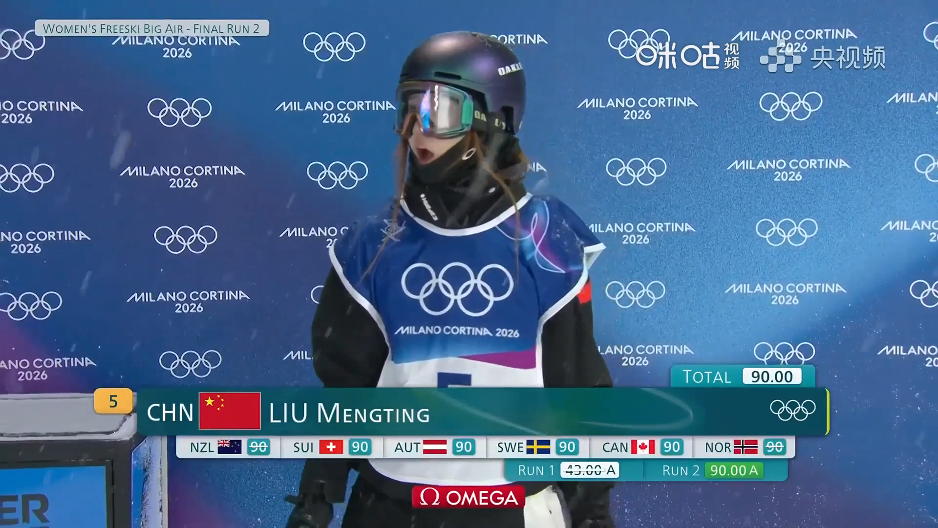 米兰冬奥会自由式滑雪女子大跳台决赛,刘梦婷第二跳1440完美完成,得到90.00的高分。