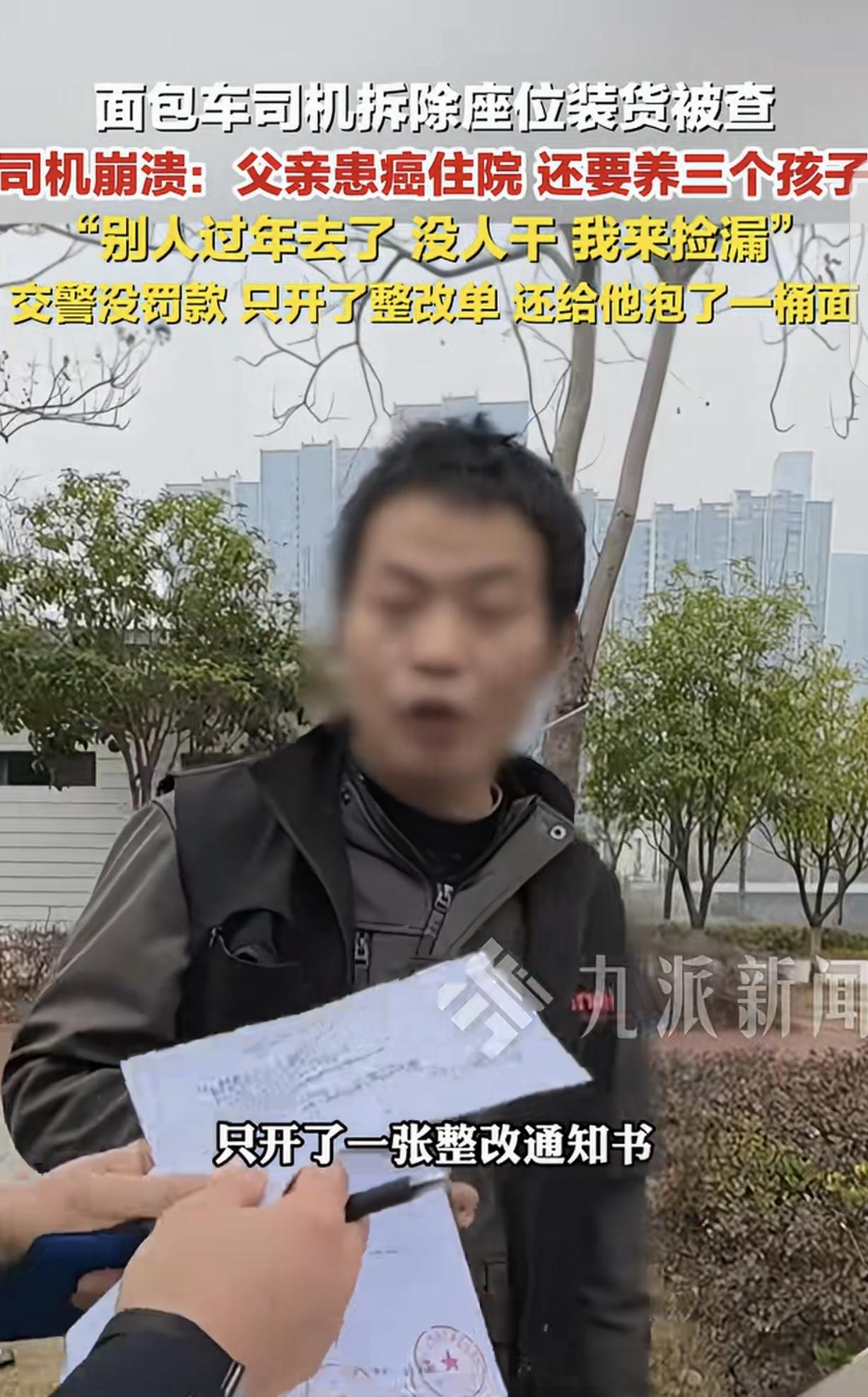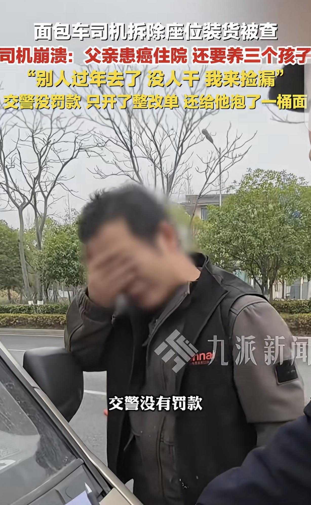 “泪目!”湖南长沙,一男子把面包车座位拆了,就为了多装货挣钱,却被交警查了,男子直接泪崩:我父亲患癌住院,还有3个孩子要养,别人都过年去了,没人干,我来捡漏。交警没罚款,只开了一张整改通知书,知道男子还饿着肚子,又给他泡了一碗热乎乎的泡面。 最近,湖南长沙街头发生的这一幕,让无数人心里五味杂陈。 那天,长沙的街头还弥漫着过年的喜庆氛围,可交警们依旧坚守在岗位上,认真检查着每一辆过往车辆。 这时,一辆面包车缓缓驶来,交警示意其停下接受检查。 当车门打开,眼前的景象让交警皱起了眉头,车里的座位全被拆了,堆满了货物。 开车的男子一下车,满脸都是紧张和不安。交警按照流程开始询问情况,男子一开始支支吾吾,眼神躲躲闪闪。 在交警的耐心追问下,他终于忍不住崩溃大哭起来,边哭边说:“我父亲患癌住院了,家里还有3个孩子要养。别人都过年去了,没人干这活,我想着来捡漏多挣点钱,就把座位拆了多装点货。” 男子说着,眼泪止不住地往下流,那哭声里满是生活的无奈和艰辛。 他告诉交警,为了给父亲治病,家里已经花光了所有积蓄,还欠了不少债。 3个孩子还小,正是需要花钱的时候,他作为家里的顶梁柱,不能眼睁睁看着家人受苦,只能趁着过年大家都休息,出来多跑几趟,多挣点钱。 交警们听了,心里都不是滋味。他们深知生活的不易,也明白男子这么做是为了这个家。 按照规定,私自拆除车辆座位是违法行为,要面临罚款等处罚。可看着眼前这个满脸泪痕、为了生活拼命奔波的男人,交警们实在不忍心再给他增加负担。 经过一番商量,交警决定不罚款了,只给男子开了一张整改通知书,要求他尽快把座位恢复原样。 男子听了,一个劲儿地点头,嘴里不停地说着“谢谢”。 这时,交警得知男子一口东西都没吃,他转身回到警车里,拿出一碗泡面,用热水泡好,端到男子面前,让他吃饱了再干活,别饿着。 男子看着那碗热气腾腾的泡面,愣了一下,双手接过泡面,随即眼眶又红了。 男子狼吞虎咽地吃着泡面,那模样让人心疼。 这碗泡面,不仅仅是一顿简单的食物,更是交警对男子的一份关爱和温暖。 这一幕,真是让人心里不是滋味,又暖又心酸。 男子为了给患癌父亲治病、养活三个孩子,大过年还出来拼命挣钱,把面包车座位拆了多装货,这背后是多少生活的重担压得他喘不过气啊。 谁不想舒舒服服过年?可他没办法,只能抓住这“捡漏”的机会多挣点。 交警的做法太暖心了。他们没有机械地执法罚款,而是考虑到了男子的实际困难,只开了整改通知书,还给他泡了泡面。 这体现了执法不仅有力度,更有温度。在法律框架内,根据具体情况灵活处理,既维护了法律尊严,又给予了困难群众帮助,这才是真正的为人民服务。 生活里,像男子这样被生活逼得走投无路的人不少。 希望能多些理解和包容,大家遇到困难时也能互相拉一把。 《道路交通安全法》第16条规定,任何单位或者个人不得拼装机动车或者擅自改变机动车已登记的结构、构造或者特征。 本案中,男子私自拆除面包车座位,改变了车辆结构,违反此规定。 但交警考虑到其家庭困难,未罚款仅要求整改,在依法执法同时兼顾了情理,让执法更有温度。 对此,你怎么看?