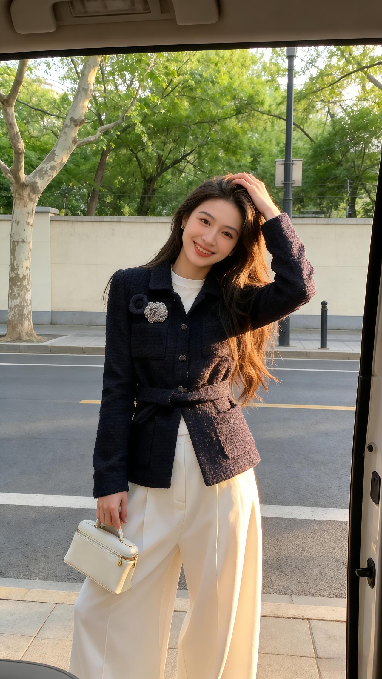 浅杏V领衫衬出柔婉气质,米白微喇裤优化身形比例,柔色搭配尽显温婉质感浅杏V领上