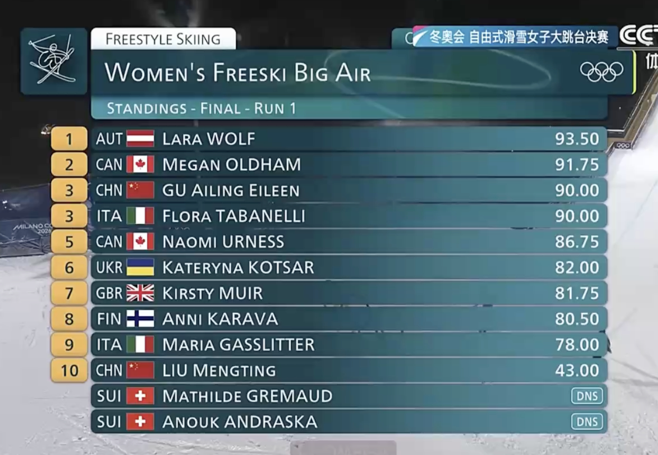 女子自由式滑雪大跳台决赛 谷爱凌第一跳90分!第一轮后并列第三~