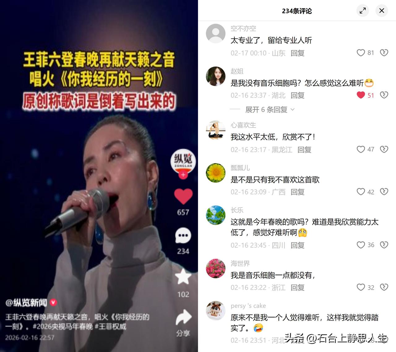 王菲六登春晚,新歌遭群嘲。 昨晚春晚,王菲唱了首《你我经历的一刻》。 官方吹是天籁之音,结果大家都在喊难听、欣赏不来,好多人还偷偷怀疑自己没音乐细胞。 后来才知道,这歌是倒写的歌词,走小众文艺挂,编曲留了好多空白,还揉了古典巴洛克的调调,核心是讲宇宙相遇的哲思。 问题根本不在王菲,也不在你! 是春晚的大众审美和这首歌的内核,完全不在一个频道上啊! 春晚观众要的啥?是年夜饭的热闹背景音,是听一遍就能跟着哼的旋律,是阖家团圆的直接暖意! 谁过年想坐在沙发上悟永恒是彼此经过这种哲思啊? 难道还得查个解析才能get到好听? 真的不用自我怀疑! 就像有人爱喝甜奶茶,有人爱喝苦手冲,审美哪有高低? 只是场合不对,期待错配而已~ 你听这歌是啥感觉?在留言里聊聊!