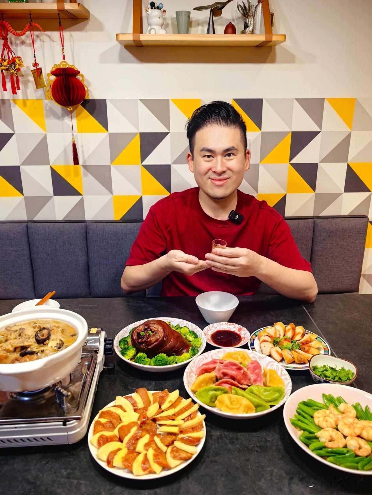 大年夜和家里领导忙活包饺子,这是她这个土生土长山东妮子坚持的守岁仪式。 因为先要辞岁敬天拜神,之后她擀皮我调馅,已经将近半夜十二点,正是交子时分,包的就是交子饺子。今年发挥创意,用火龙果、菠菜、胡萝卜染色,包出五颜六色的白菜猪肉饺子,真正是元宝滚滚包百财,四面八方都来财! 年夜饭除了饺子,还有富贵圆蹄,象征踢走霉运;乌鱼子配苹果,代表多子多孙、平平安安;台式虾卷,卷起满满福气;翡翠烩虾仁,寓意鸿运当头。另佐上台湾宴席必备的佛跳牆,凑成一桌红红火火,吃不完还有剩,正好就是年年有余!